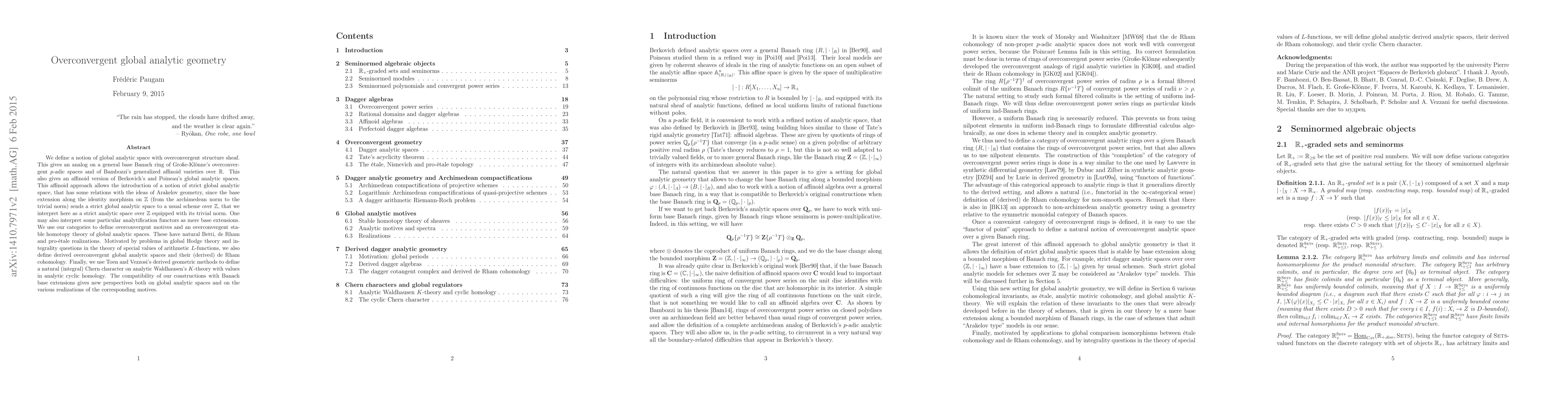 This paper introduces global analytic spaces with an overconvergent structure sheaf, providing an analog for general Banach rings and linking to Arakelov geometry. It also defines overconvergent motives and stable homotopy theory, and explores applications to global Hodge theory and arithmetic L-functions.