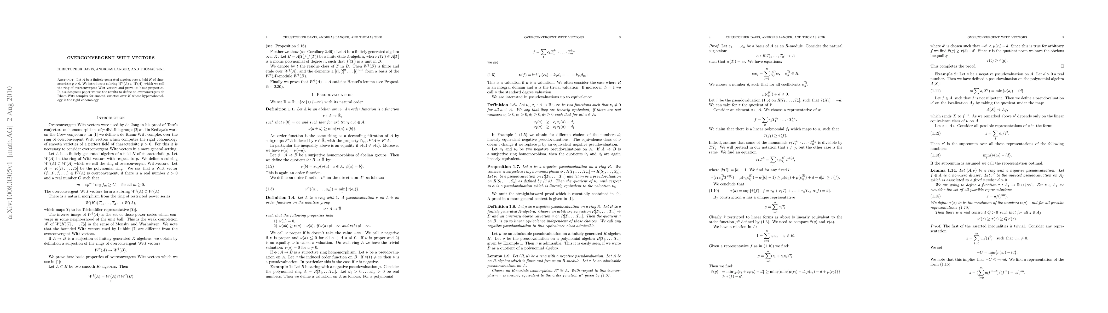 This paper introduces the ring of overconvergent Witt vectors as a subring of the Witt vectors for a finitely generated algebra over a field of characteristic p > 0, demonstrating that it forms an étale sheaf on schemes of finite type over K. A subsequent paper will define an overconvergent de Rham-Witt complex whose hypercohomology corresponds to the rigid cohomology of smooth schemes over perfect fields.