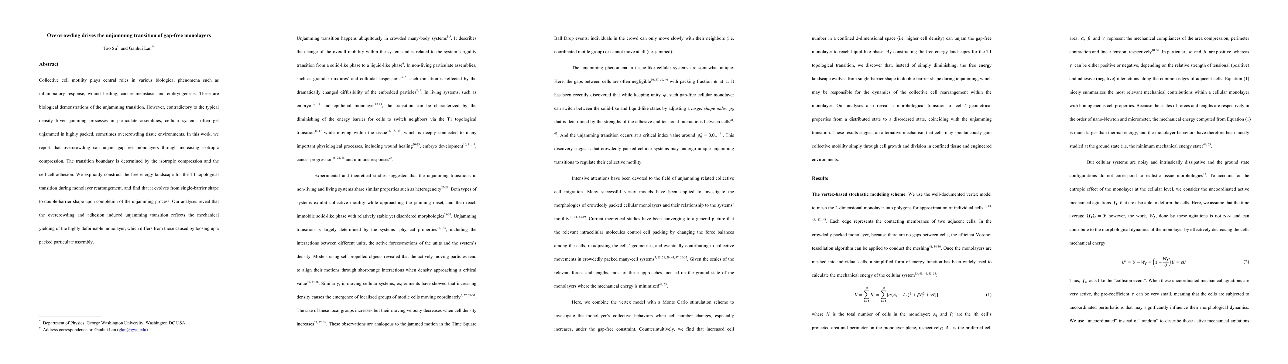 This paper explores how overcrowding can induce an unjamming transition in gap-free monolayers, contrasting typical jamming processes in particulate systems. The study reveals that this transition is driven by isotropic compression and cell-cell adhesion, leading to a change in the free energy landscape from single-barrier to double-barrier during monolayer rearrangement.