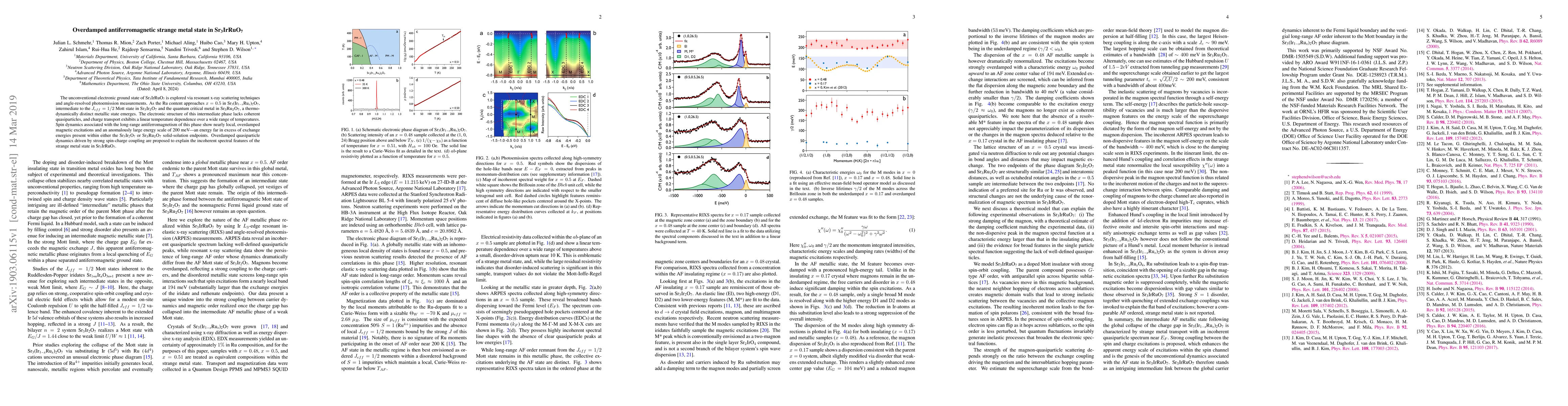 The unconventional electronic ground state of Sr$_3$IrRuO$_7$ is explored via resonant x-ray scattering techniques and angle-resolved photoemission measurements. As the Ru content approaches $x=0.5$ in Sr$_3$(Ir$_{1-x}$Ru$_x$)$_2$O$_7$, intermediate to the $J_{eff}=1/2$ Mott state in Sr$_3$Ir$_2$O$_7$ and the quantum critical metal in Sr$_3$Ru$_2$O$_7$, a thermodynamically distinct metallic state emerges. The electronic structure of this intermediate phase lacks coherent quasiparticles, and charge transport exhibits a linear temperature dependence over a wide range of temperatures. Spin dynamics associated with the long-range antiferromagnetism of this phase show nearly local, overdamped magnetic excitations and an anomalously large energy scale of 200 meV---an energy far in excess of exchange energies present within either the Sr$_3$Ir$_2$O$_7$ or Sr$_3$Ru$_2$O$_7$ solid-solution endpoints. Overdamped quasiparticle dynamics driven by strong spin-charge coupling are proposed to explain the incoherent spectral features of the strange metal state in Sr$_3$IrRuO$_7$.