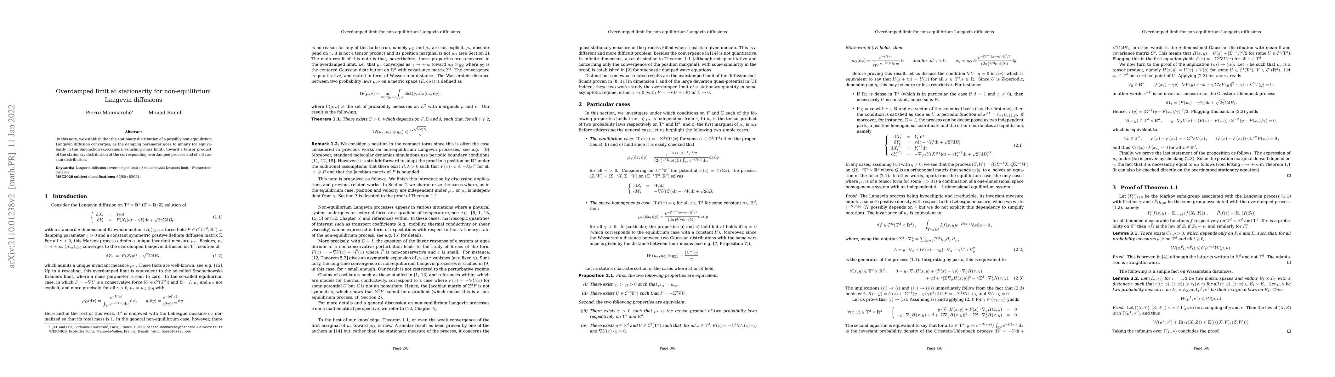 Summary: The paper demonstrates that the stationary distribution of non-equilibrium Langevin diffusions converges to a tensor product of the stationary distribution of the overdamped process and a Gaussian distribution as the damping parameter approaches infinity. This result highlights the behavior of the system in the overdamped limit.