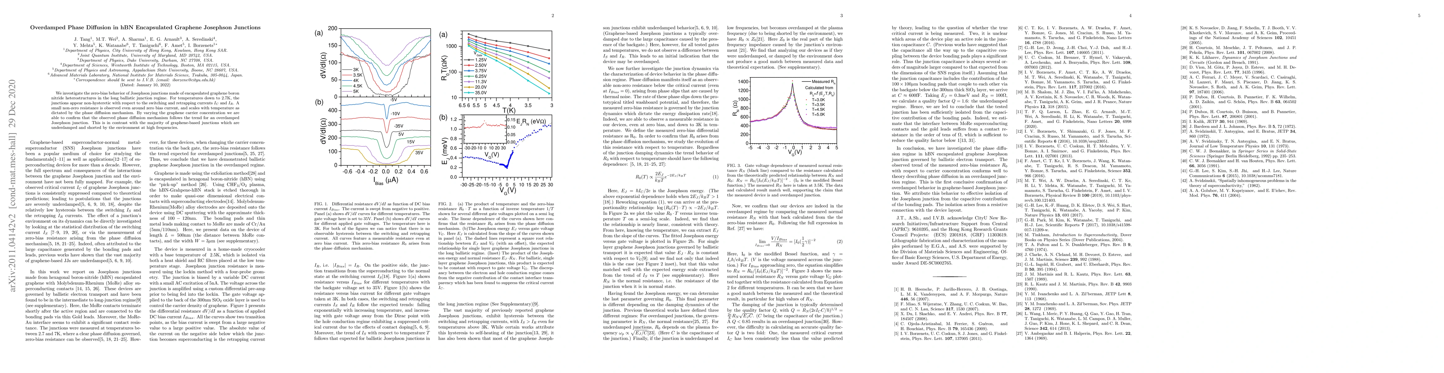 We investigate the zero-bias behavior of Josephson junctions made of encapsulated graphene boron nitride heterostructures in the long ballistic junction regime. For temperatures down to 2.7K, the junctions appear non-hysteretic with respect to the switching and retrapping currents $I_C$ and $I_R$. A small non-zero resistance is observed even around zero bias current, and scales with temperature as dictated by the phase diffusion mechanism. By varying the graphene carrier concentration we are able to confirm that the observed phase diffusion mechanism follows the trend for an overdamped Josephson junction. This is in contrast with the majority of graphene-based junctions which are underdamped and shorted by the environment at high frequencies.