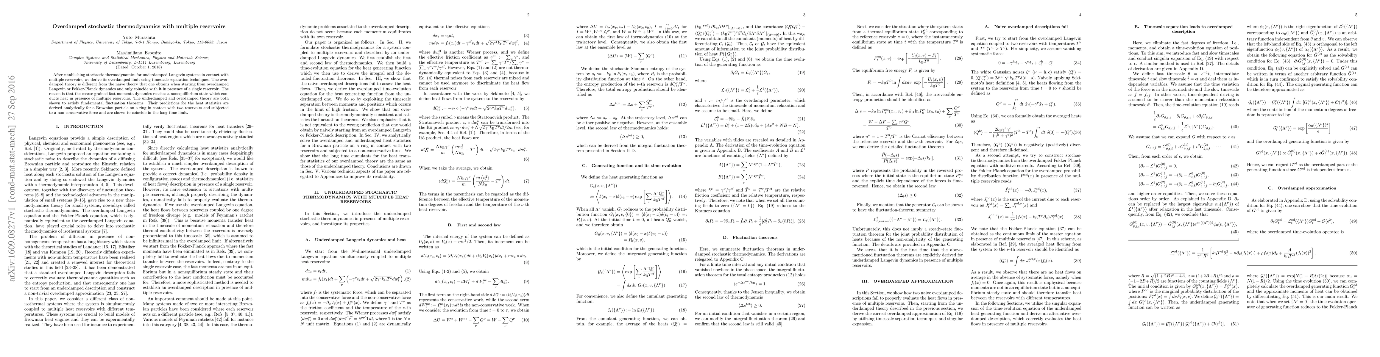 This paper derives the overdamped stochastic thermodynamics for systems in contact with multiple heat reservoirs, showing that it differs from the naive overdamped theory due to nonequilibrium dynamics in fast momenta. Both underdamped and overdamped theories satisfy fundamental fluctuation theorems, and their predictions for heat statistics are analytically derived for a Brownian particle on a ring.