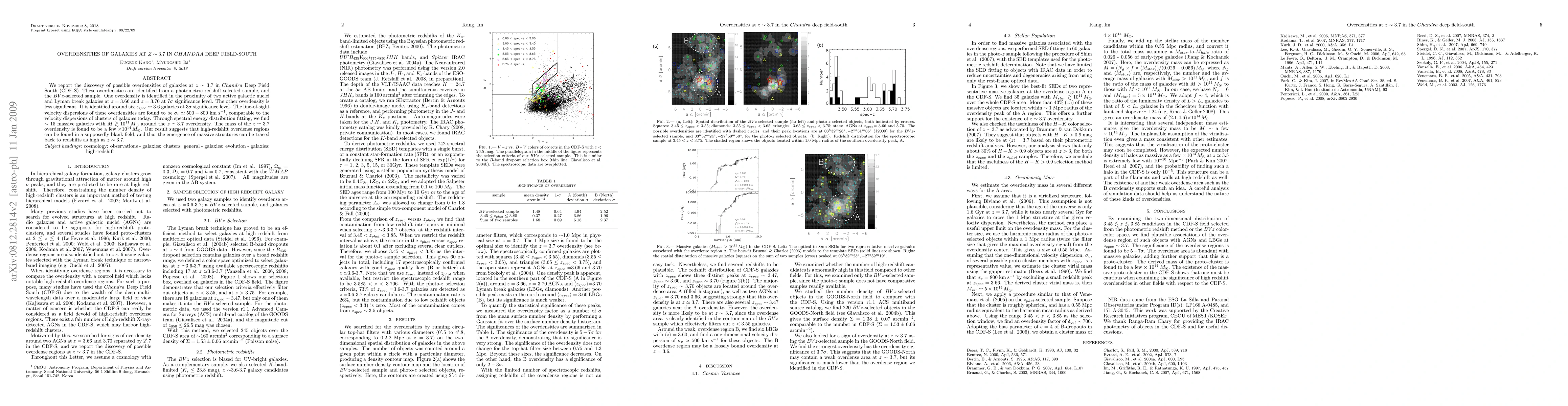 The paper reports the discovery of significant overdensities of galaxies at z ~ 3.7 in the Chandra Deep Field South, identified through photometric and spectroscopic redshifts, suggesting the emergence of massive structures as early as z ~ 3.7. The overdensities exhibit velocity dispersions comparable to present-day galaxy clusters.