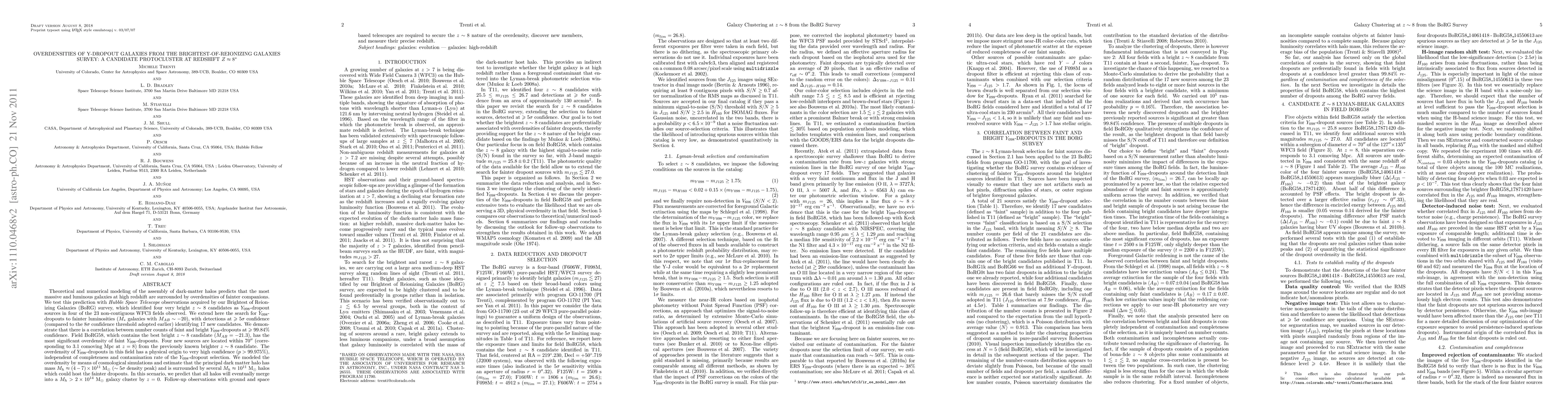 Theoretical and numerical modeling of dark-matter halo assembly predicts that the most luminous galaxies at high redshift are surrounded by overdensities of fainter companions. We test this prediction with HST observations acquired by our Brightest of Reionizing Galaxies (BoRG) survey, which identified four very bright z~8 candidates as Y-dropout sources in four of the 23 non-contiguous WFC3 fields observed. We extend here the search for Y-dropouts to fainter luminosities (M_* galaxies with M_AB\sim-20), with detections at >5sigma confidence (compared to >8sigma confidence adopted earlier) identifying 17 new candidates. We demonstrate that there is a correlation between number counts of faint and bright Y-dropouts at >99.84% confidence. Field BoRG58, which contains the best bright z\sim8 candidate (M_AB=-21.3), has the most significant overdensity of faint Y-dropouts. Four new sources are located within 70arcsec (corresponding to 3.1 comoving Mpc at z=8) from the previously known brighter z\sim8 candidate. The overdensity of Y-dropouts in this field has a physical origin to high confidence (p>99.975%), independent of completeness and contamination rate of the Y-dropout selection. We modeled the overdensity by means of cosmological simulations and estimate that the principal dark matter halo has mass M_h\sim(4-7)x10^11Msun (\sim5sigma density peak) and is surrounded by several M_h\sim10^11Msun halos which could host the fainter dropouts. In this scenario, we predict that all halos will eventually merge into a M_h>2x10^14Msun galaxy cluster by z=0. Follow-up observations with ground and space based telescopes are required to secure the z\sim8 nature of the overdensity, discover new members, and measure their precise redshift.