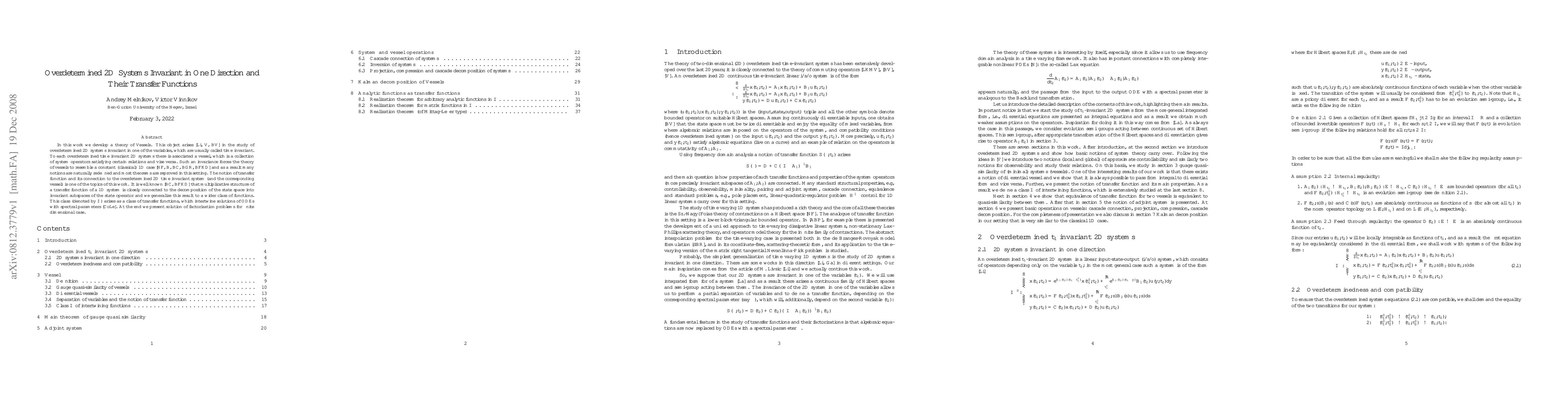 In this work we develop a theory of Vessels. This object arises in the study of overdetermined 2D systems invariant in one of the variables, which are usually called time invariant. To each overdetermined time invariant 2D systems there is associated a vessel, which is a collection of system operators satisfying certain relations and vise versa. Such an invariance forces the theory of vessels to resemble a constant (classical) 1D case and as a result many notions are naturally redefined and most theorems are reproved in this setting. The notion of transfer function and its connection to the overdetermined 2D time invariant system (and the corresponding vessel) is one of the topics of this work. It is well known that multiplicative structure of a transfer function of a 1D system is closely connected to the decomposition of the state space into invariant subspaces of the state operator and we generalize this result to a wider class of functions. This class (denoted by $\boldsymbol {\mathcal I}$) arises as a class of transfer functions, which intertwine solutions of ODEs with spectral parameters. At the end we present solution of factorization problems for finite dimensional case.