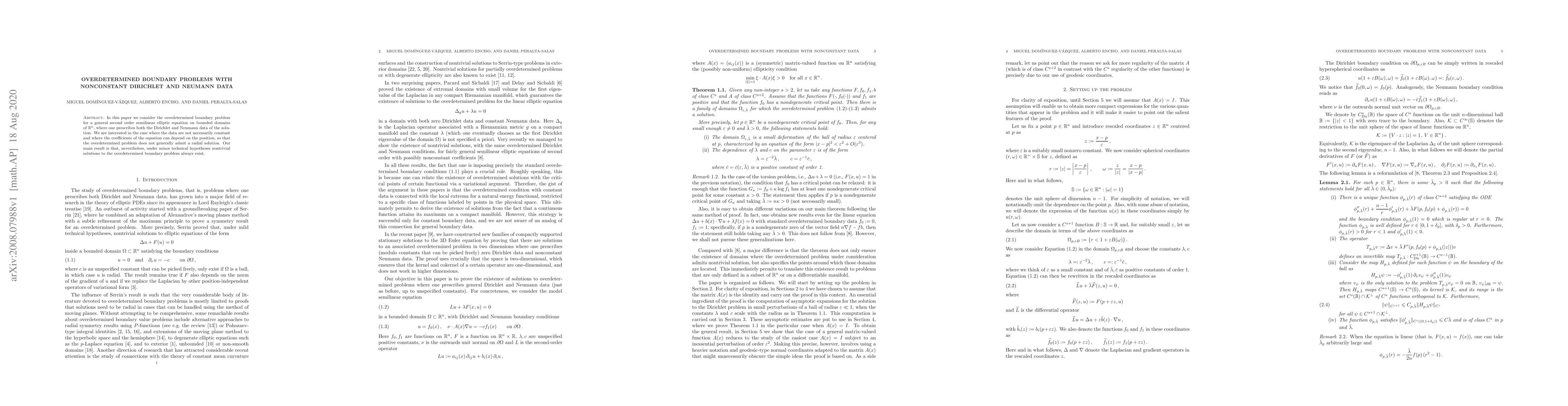 In this paper we consider the overdetermined boundary problem for a general second order semilinear elliptic equation on bounded domains of $\mathbf{R}^n$, where one prescribes both the Dirichlet and Neumann data of the solution. We are interested in the case where the data are not necessarily constant and where the coefficients of the equation can depend on the position, so that the overdetermined problem does not generally admit a radial solution. Our main result is that, nevertheless, under minor technical hypotheses nontrivial solutions to the overdetermined boundary problem always exist.