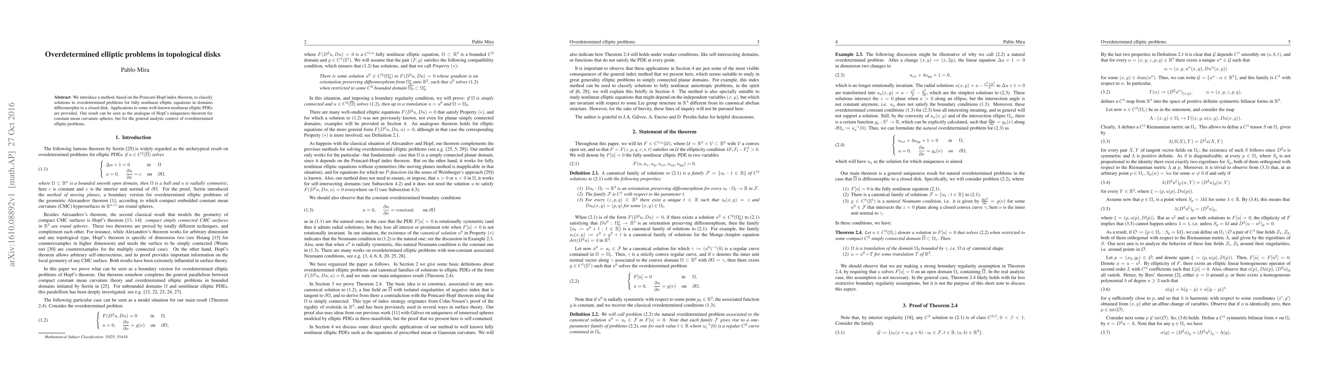 This paper develops a method using the Poincare-Hopf index theorem to classify solutions for overdetermined nonlinear elliptic equations in topological disks, extending Hopf's uniqueness theorem to the general analytic context of such problems. Applications to specific nonlinear elliptic PDEs are also discussed.