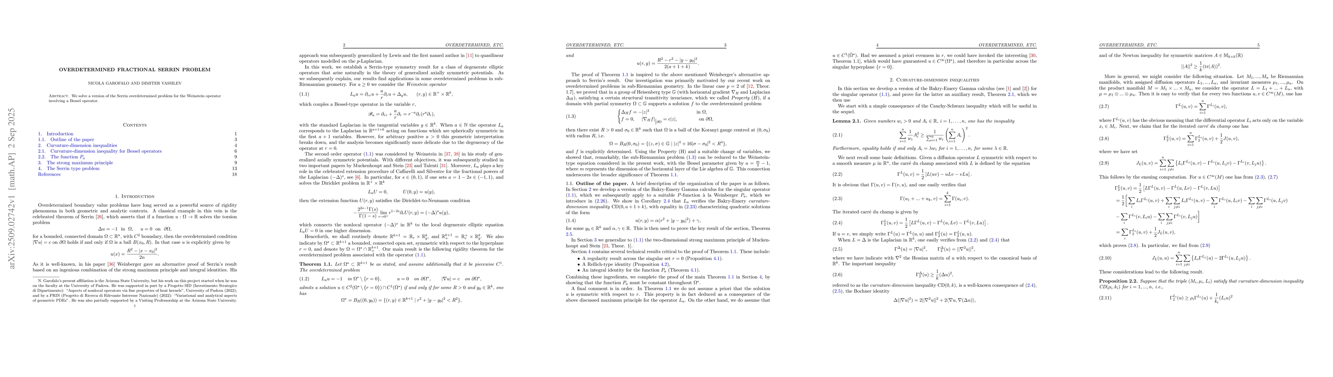 We solve a version of the Serrin overdetermined problem for the Weinstein operator involving a Bessel operator.