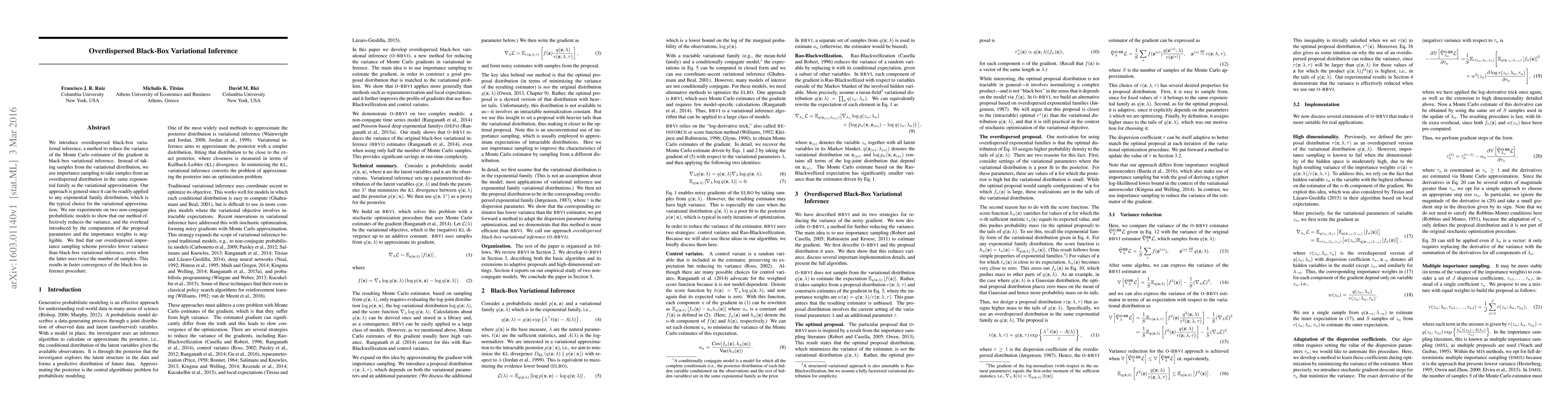 This paper proposes overdispersed black-box variational inference to reduce the variance of Monte Carlo gradient estimators in variational inference. It uses importance sampling from an overdispersed distribution to achieve lower variance, demonstrating faster convergence in non-conjugate probabilistic models compared to traditional methods.