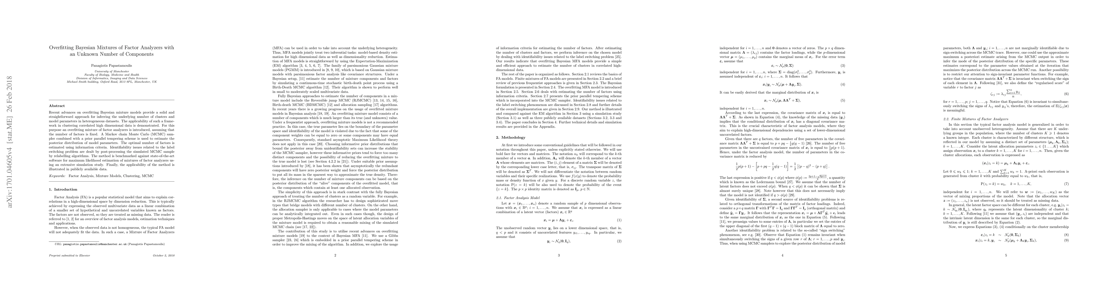 This paper introduces an overfitting Bayesian mixture of factor analyzers to infer the optimal number of components in high-dimensional data, employing MCMC and prior parallel tempering. It addresses identifiability issues and is benchmarked against maximum likelihood methods using simulations and real datasets.