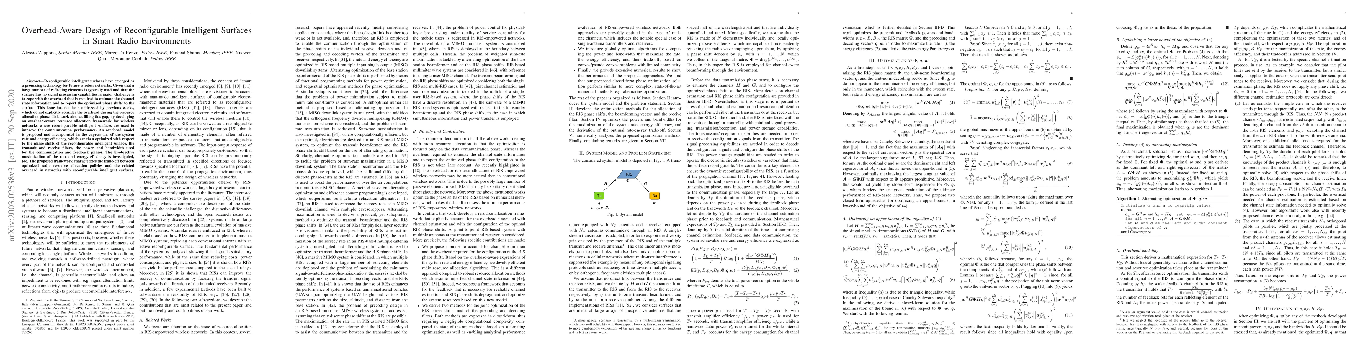 Reconfigurable intelligent surfaces have emerged as a promising technology for future wireless networks. Given that a large number of reflecting elements is typically used, and that the surface has no signal processing capabilities, a major challenge is to cope with the overhead that is required to estimate the channel state information and to report the optimized phase shifts to the surface. This issue has not been addressed by previous works, which do not explicitly consider the overhead during the resource allocation phase. This work aims at filling this gap, developing an overhead-aware resource allocation framework for wireless networks where reconfigurable intelligent surfaces are used to improve the communication performance. An overhead model is developed and incorporated in the expressions of the system rate and energy efficiencies, which are then optimized with respect to the phase shifts of the reconfigurable intelligent surface, the transmit and receive filters, and the power and bandwidth used for the communication and feedback phases. The bi-objective maximization of the rate and energy efficiency is carried out as well. The proposed framework allows characterizing the trade-off between optimized radio resources and the related overhead in networks with reconfigurable intelligent surfaces.