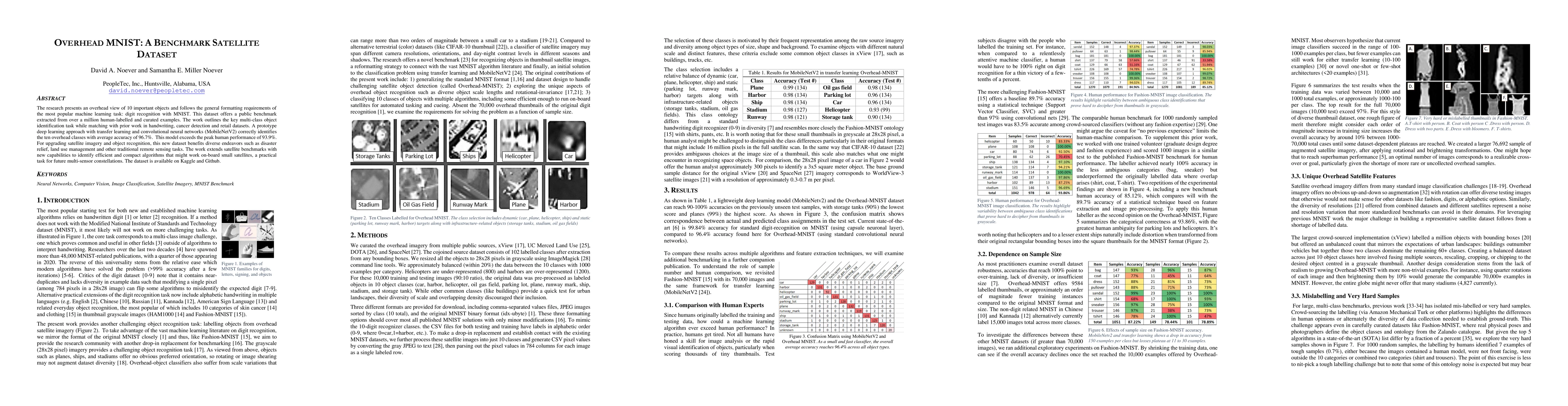 The research presents an overhead view of 10 important objects and follows the general formatting requirements of the most popular machine learning task: digit recognition with MNIST. This dataset offers a public benchmark extracted from over a million human-labelled and curated examples. The work outlines the key multi-class object identification task while matching with prior work in handwriting, cancer detection, and retail datasets. A prototype deep learning approach with transfer learning and convolutional neural networks (MobileNetV2) correctly identifies the ten overhead classes with an average accuracy of 96.7%. This model exceeds the peak human performance of 93.9%. For upgrading satellite imagery and object recognition, this new dataset benefits diverse endeavors such as disaster relief, land use management, and other traditional remote sensing tasks. The work extends satellite benchmarks with new capabilities to identify efficient and compact algorithms that might work on-board small satellites, a practical task for future multi-sensor constellations. The dataset is available on Kaggle and Github.