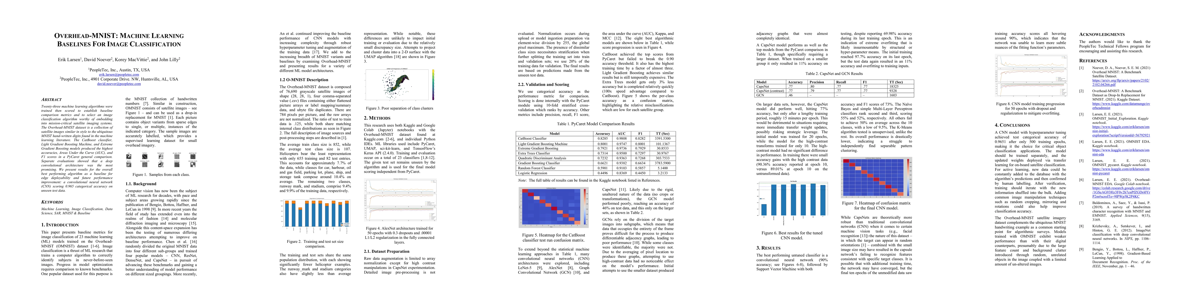 Twenty-three machine learning algorithms were trained then scored to establish baseline comparison metrics and to select an image classification algorithm worthy of embedding into mission-critical satellite imaging systems. The Overhead-MNIST dataset is a collection of satellite images similar in style to the ubiquitous MNIST hand-written digits found in the machine learning literature. The CatBoost classifier, Light Gradient Boosting Machine, and Extreme Gradient Boosting models produced the highest accuracies, Areas Under the Curve (AUC), and F1 scores in a PyCaret general comparison. Separate evaluations showed that a deep convolutional architecture was the most promising. We present results for the overall best performing algorithm as a baseline for edge deployability and future performance improvement: a convolutional neural network (CNN) scoring 0.965 categorical accuracy on unseen test data.