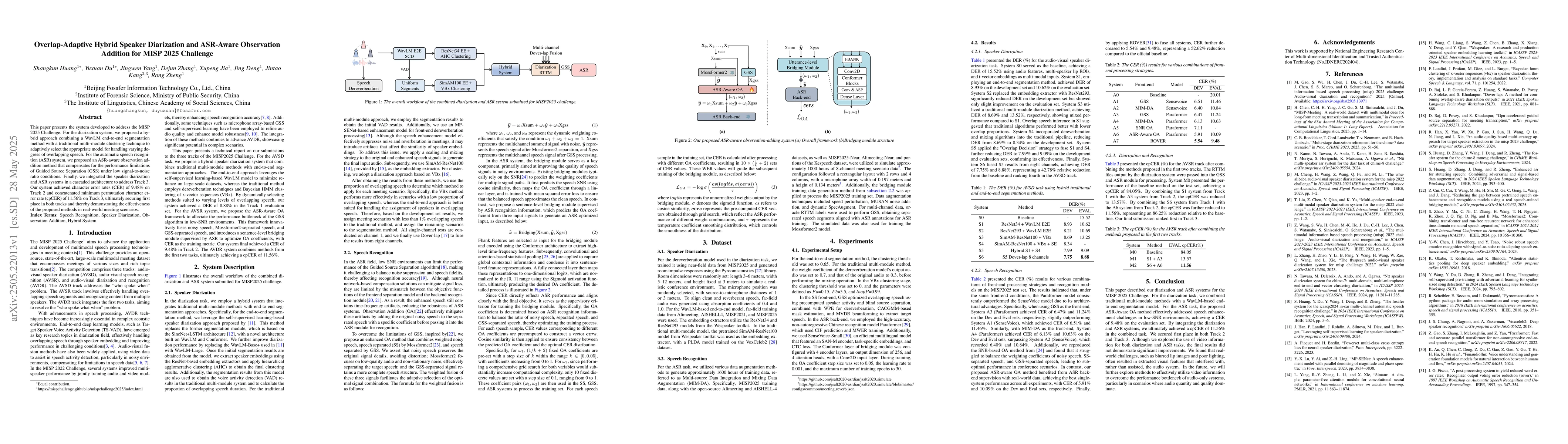 This paper presents the system developed to address the MISP 2025 Challenge. For the diarization system, we proposed a hybrid approach combining a WavLM end-to-end segmentation method with a traditional multi-module clustering technique to adaptively select the appropriate model for handling varying degrees of overlapping speech. For the automatic speech recognition (ASR) system, we proposed an ASR-aware observation addition method that compensates for the performance limitations of Guided Source Separation (GSS) under low signal-to-noise ratio conditions. Finally, we integrated the speaker diarization and ASR systems in a cascaded architecture to address Track 3. Our system achieved character error rates (CER) of 9.48% on Track 2 and concatenated minimum permutation character error rate (cpCER) of 11.56% on Track 3, ultimately securing first place in both tracks and thereby demonstrating the effectiveness of the proposed methods in real-world meeting scenarios.