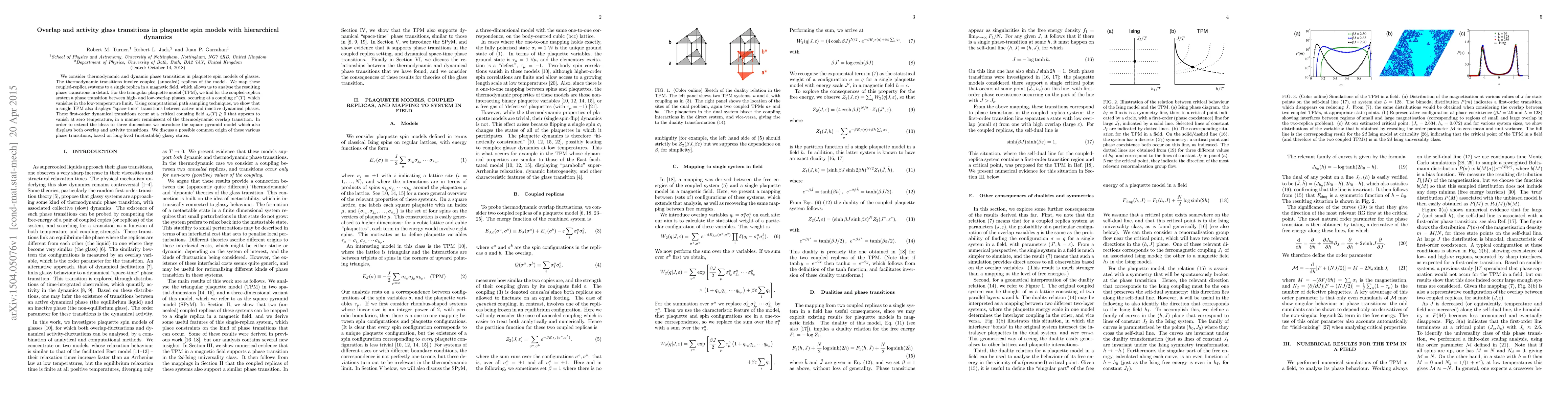 We consider thermodynamic and dynamic phase transitions in plaquette spin models of glasses. The thermodynamic transitions involve coupled (annealed) replicas of the model. We map these coupled-replica systems to a single replica in a magnetic field, which allows us to analyse the resulting phase transitions in detail. For the triangular plaquette model (TPM), we find for the coupled-replica system a phase transition between high- and low-overlap phases, occuring at a coupling eps*(T), which vanishes in the low-temperature limit. Using computational path sampling techniques, we show that a single TPM also displays space-time transitions between active and inactive dynamical phases. These first-order dynamical transitions occur at a critical counting field s_c(T)>=0 that appears to vanish at zero temperature, in a manner reminiscent of the thermodynamic overlap transition. In order to extend the ideas to three dimensions we introduce the square pyramid model which also displays both overlap and activity transitions. We discuss a possible common origin of these various phase transitions, based on long-lived (metastable) glassy states.