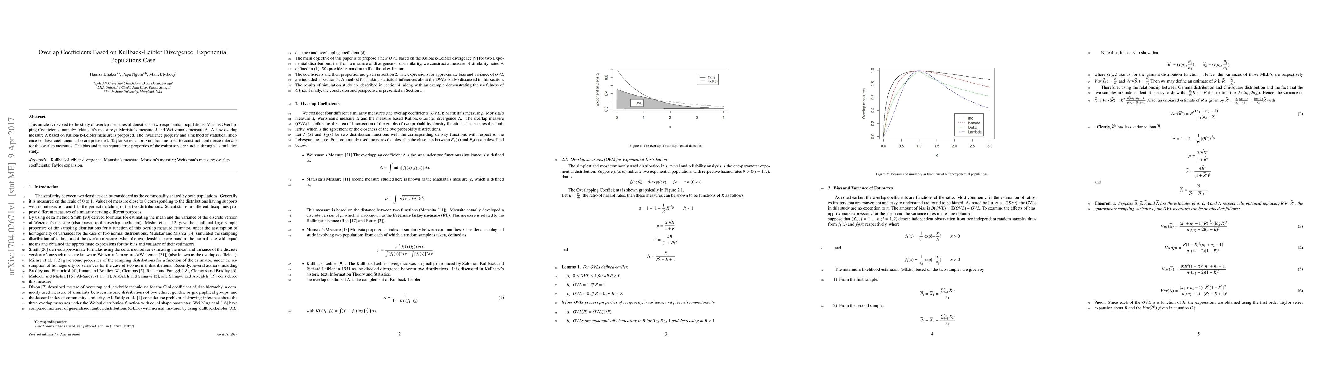 This article is devoted to the study of overlap measures of densities of two exponential populations. Various Overlapping Coefficients, namely: Matusita's measure $\rho$, Morisita's measure $\lambda$ and Weitzman's measure $\Delta$. A new overlap measure $\Lambda$ based on Kullback-Leibler measure is proposed. The invariance property and a method of statistical inference of these coefficients also are presented. Taylor series approximation are used to construct confidence intervals for the overlap measures. The bias and mean square error properties of the estimators are studied through a simulation study.