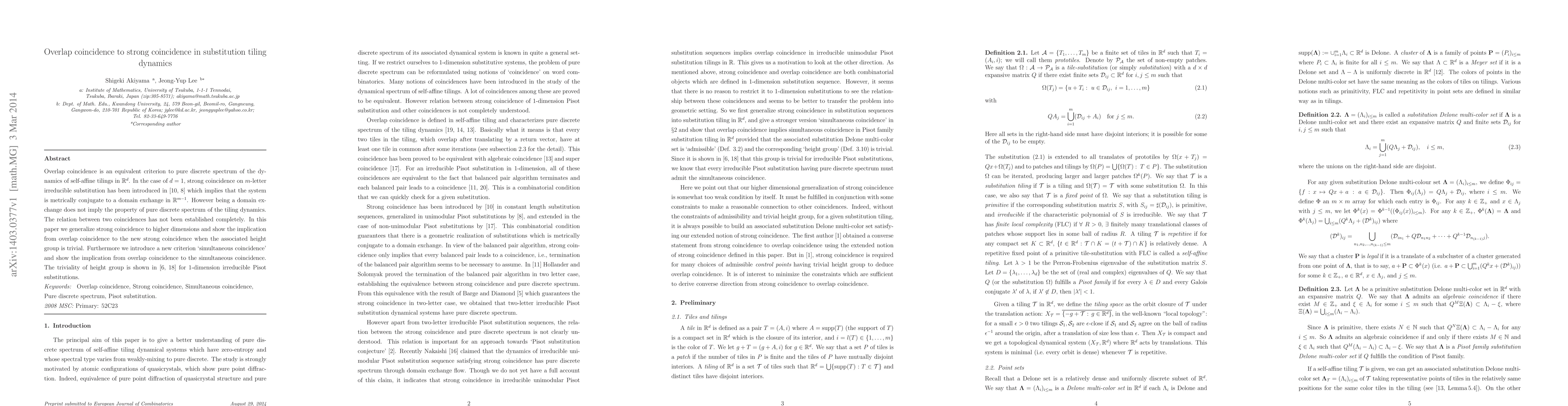Overlap coincidence is an equivalent criterion to pure discrete spectrum of the dynamics of self affine tilings. In the case of one dimension, strong coincidence on m letter irreducible substitution has been introduced in Dekking (1978) and Arnoux and Ito (2001) which implies that the system is metrically conjugate to a domain exchange. However being a domain exchange does not imply the property of pure discrete spectrum of the tiling dynamics. The relation between two coincidences has not been established completely. In this paper we generalize strong coincidence to higher dimensions and show the implication from overlap coincidence to the new strong coincidence when the associated height group is trivial. Furthermore we introduce a new criterion simultaneous coincidence and show the implication from overlap coincidence to the simultaneous coincidence. The triviality of the height group is shown in Barge and Kwapisz (2006) and Sing (2006) for 1 dimension irreducible Pisot substitutions.