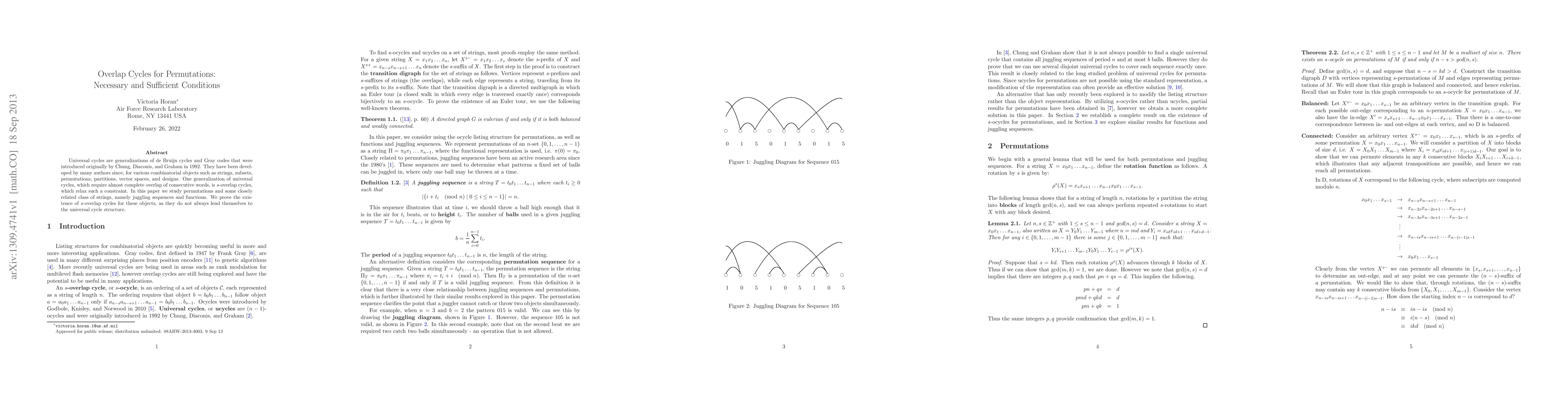 This paper investigates $s$-overlap cycles for permutations and related juggling sequences, proving their existence when universal cycles are not feasible. It generalizes previous work on universal cycles and extends the concept to objects requiring less stringent overlap conditions.