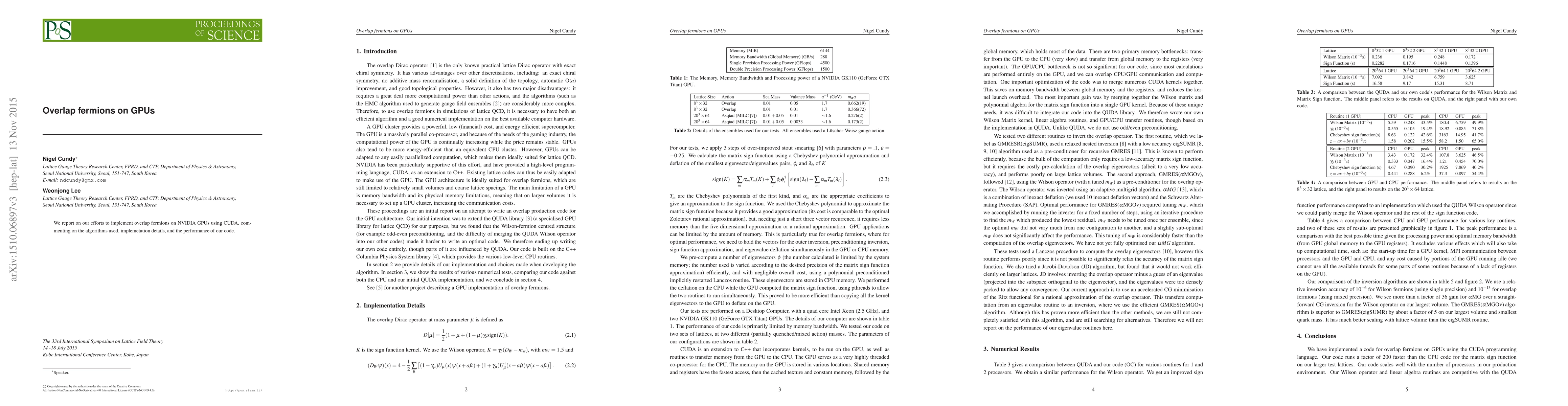 This paper details the implementation of overlap fermions on GPUs using CUDA, focusing on the algorithms and performance of the code, demonstrating significant computational efficiency for lattice QCD simulations.