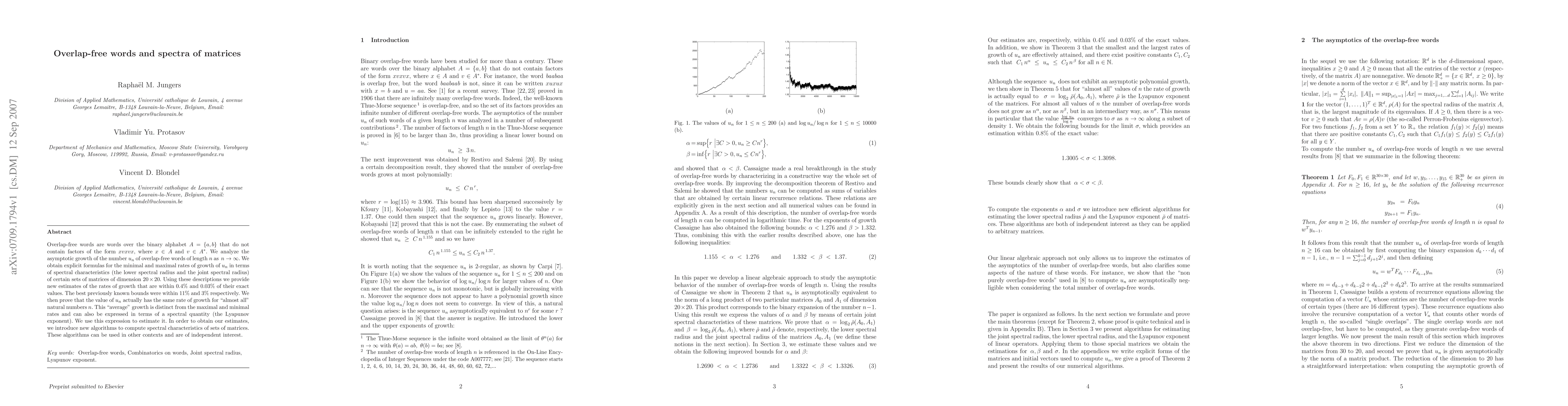 Overlap-free words are words over the binary alphabet $A=\{a, b\}$ that do not contain factors of the form $xvxvx$, where $x \in A$ and $v \in A^*$. We analyze the asymptotic growth of the number $u_n$ of overlap-free words of length $n$ as $ n \to \infty$. We obtain explicit formulas for the minimal and maximal rates of growth of $u_n$ in terms of spectral characteristics (the lower spectral radius and the joint spectral radius) of certain sets of matrices of dimension $20 \times 20$. Using these descriptions we provide new estimates of the rates of growth that are within 0.4% and $0.03 %$ of their exact values. The best previously known bounds were within 11% and 3% respectively. We then prove that the value of $u_n$ actually has the same rate of growth for ``almost all'' natural numbers $n$. This ``average'' growth is distinct from the maximal and minimal rates and can also be expressed in terms of a spectral quantity (the Lyapunov exponent). We use this expression to estimate it. In order to obtain our estimates, we introduce new algorithms to compute spectral characteristics of sets of matrices. These algorithms can be used in other contexts and are of independent interest.