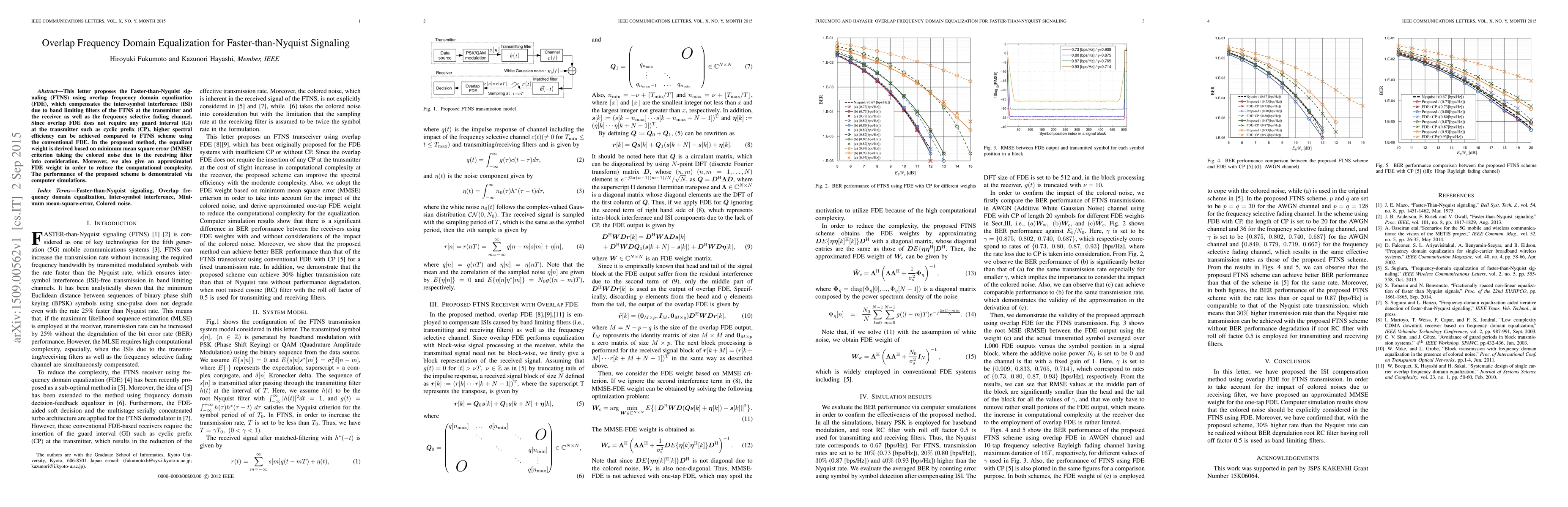 This paper proposes Faster-than-Nyquist signaling (FTNS) using overlap frequency domain equalization (FDE) to mitigate inter-symbol interference, achieving higher spectral efficiency without requiring guard intervals. The equalizer weights are derived based on minimum mean square error criteria, with an approximated weight to reduce computational complexity.