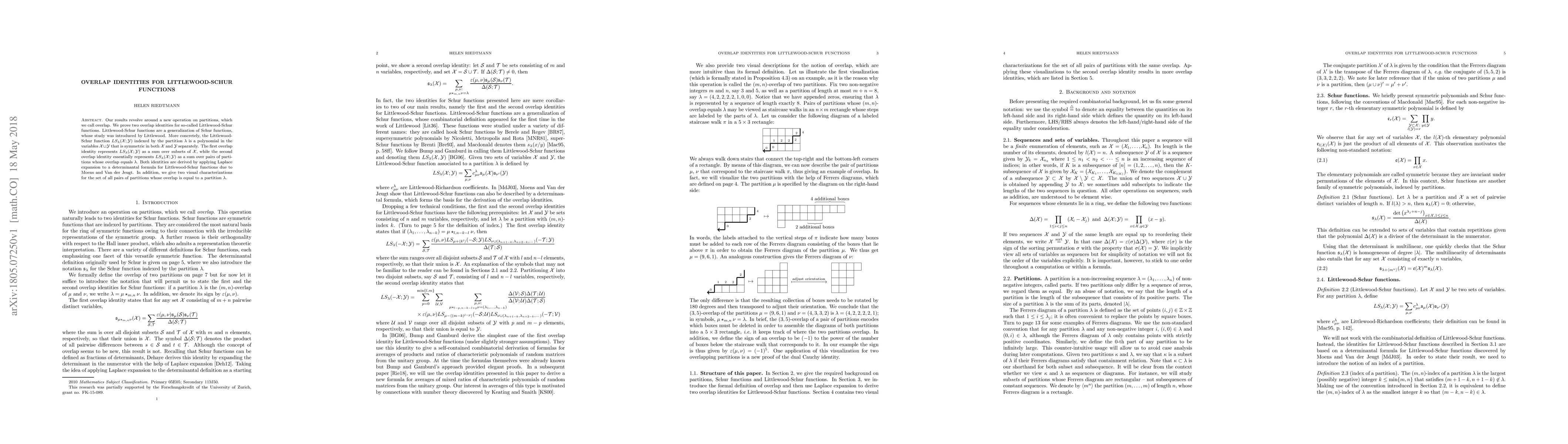 This paper introduces a new "overlap" operation on partitions and proves two identities for Littlewood-Schur functions, derived using Laplace expansion on a determinantal formula. The identities express these functions as sums over subsets and pairs of partitions with specified overlap.