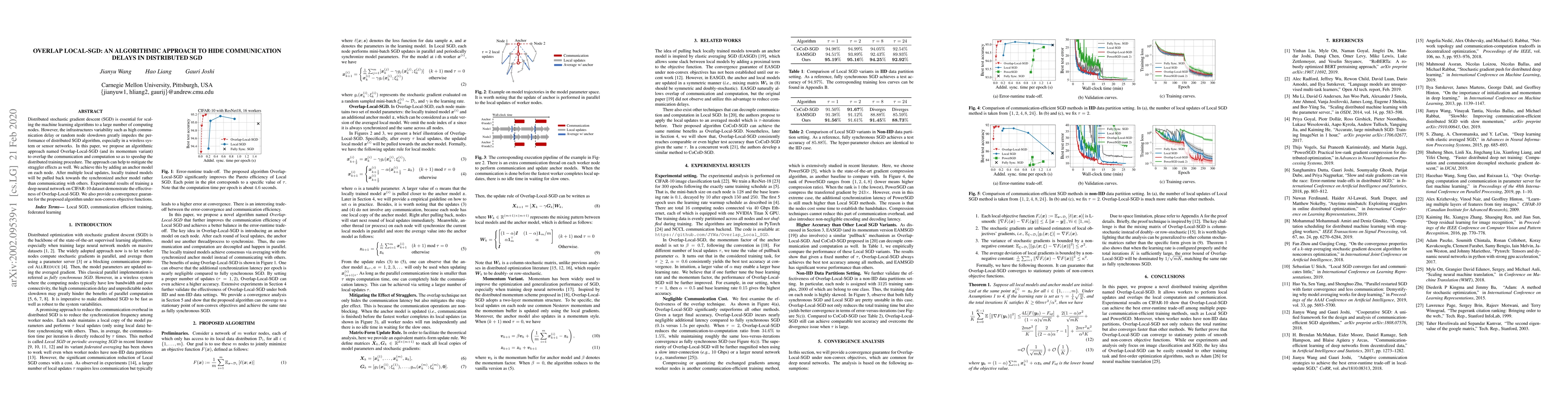 This paper proposes Overlap-Local-SGD to mitigate communication delays in distributed SGD, by overlapping computation and communication through an anchor model. Experimental results on CIFAR-10 show its effectiveness in speeding up training and reducing straggler effects, with a convergence guarantee under non-convex functions.