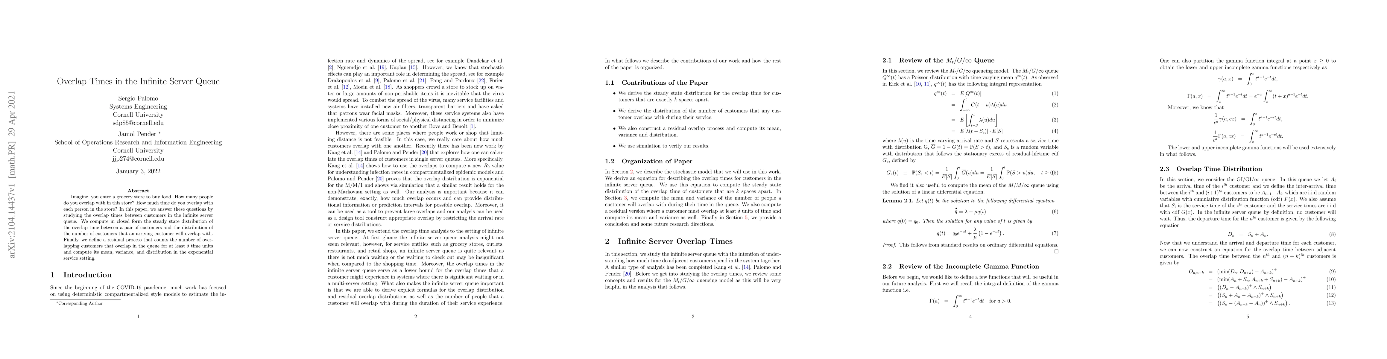 Imagine, you enter a grocery store to buy food. How many peopledo you overlap with in this store? How much time do you overlap witheach person in the store? In this paper, we answer these questions bystudying the overlap times between customers in the infinite serverqueue. We compute in closed form the steady state distribution ofthe overlap time between a pair of customers and the distribution ofthe number of customers that an arriving customer will overlap with.Finally, we define a residual process that counts the number of over-lapping customers that overlap in the queue for at least{\delta}time unitsand compute its mean, variance, and distribution in the exponentialservice setting