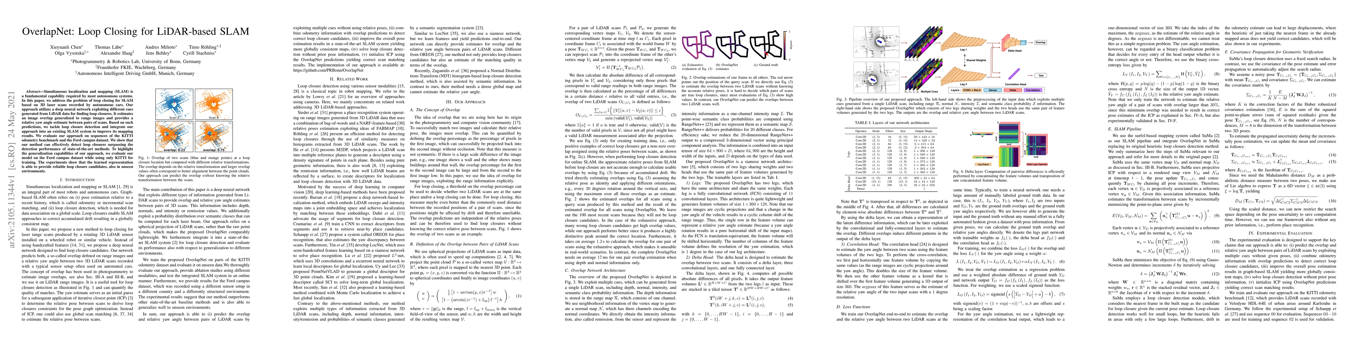The research presents OverlapNet, a deep neural network for loop closure detection in LiDAR-based SLAM. It exploits multiple cues from LiDAR data, including range, normal, intensity, and semantic class probability information, to estimate an image overlap generalized to range images and provide a relative yaw angle estimate between pairs of scans.