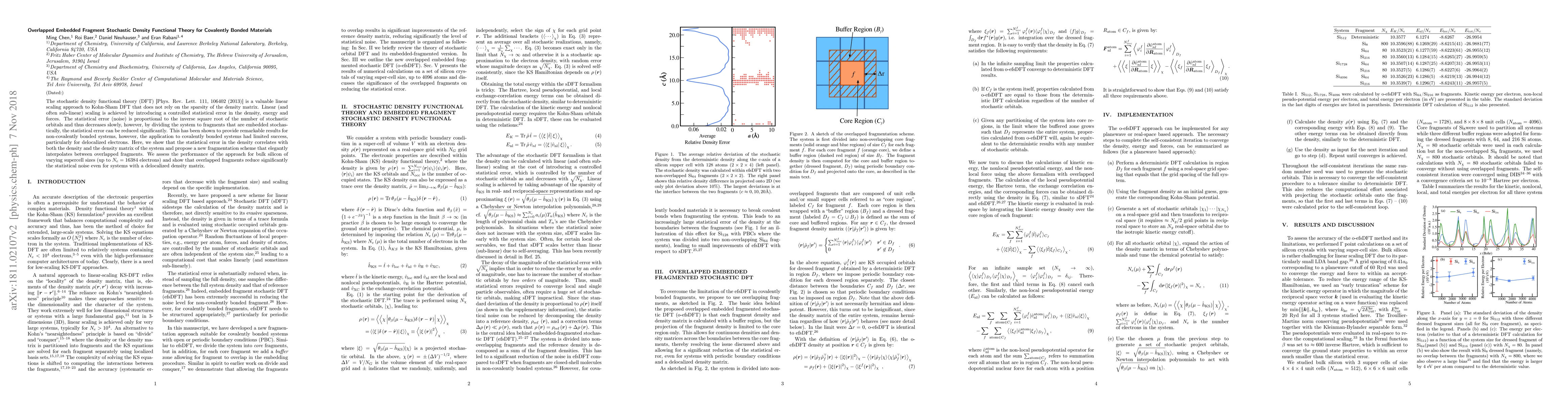 The research introduces Overlapped Embedded Fragment Stochastic Density Functional Theory (o-efsDFT) for covalently bonded materials, which uses a new fragmentation scheme to reduce statistical noise in density and forces. It involves dividing the system into non-overlapping core fragments and overlapped dressed fragments with buffer zones.