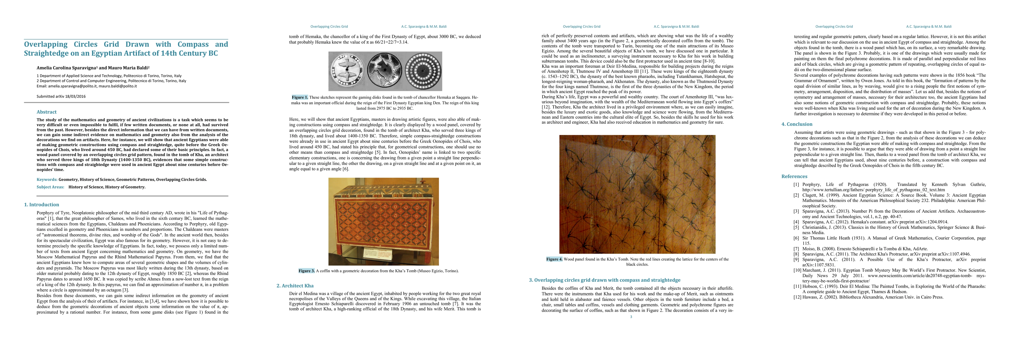 This paper demonstrates that ancient Egyptians utilized compass and straightedge for geometric constructions on a 14th-century BC artifact, predating Greek principles by nearly nine centuries. The wood panel from the tomb of architect Kha features an overlapping circles grid, providing indirect evidence of advanced geometric knowledge.