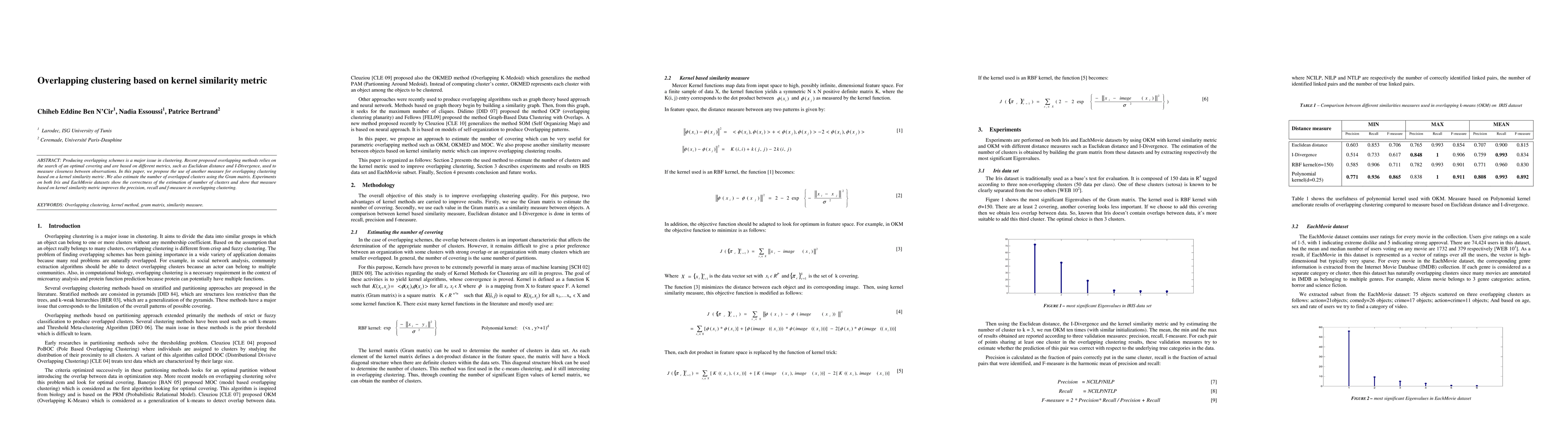 This paper proposes an overlapping clustering method based on a kernel similarity metric, estimating the number of overlapped clusters using the Gram matrix. Experiments on Iris and EachMovie datasets demonstrate improved precision, recall, and f-measure compared to traditional methods.