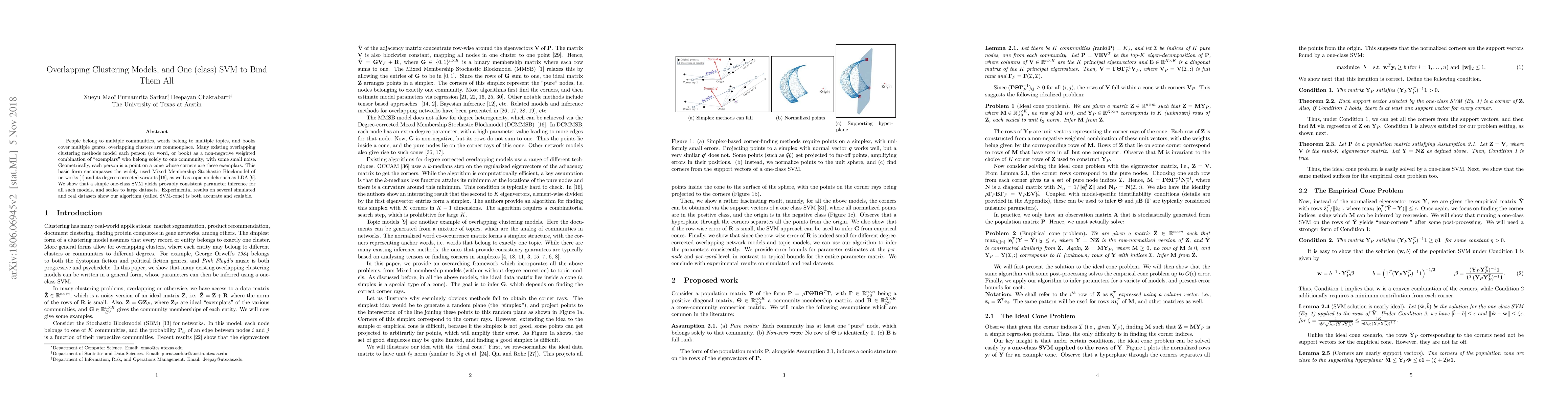 A new algorithm called SVM-cone uses one-class support vector machines to accurately infer parameters for overlapping clustering models, including person communities, word topics, and book genres, in both simulated and real datasets.