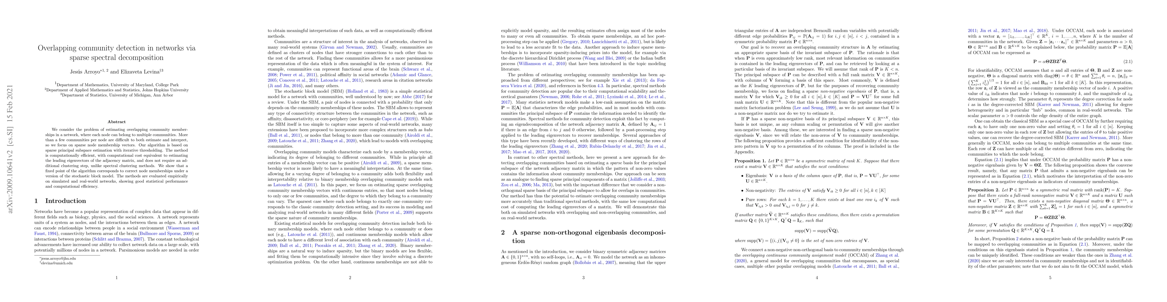 This paper proposes a sparse spectral decomposition algorithm for detecting overlapping communities in networks, focusing on sparse node membership vectors. The method efficiently estimates leading eigenvectors and does not require additional clustering, demonstrating good statistical performance and computational efficiency on both simulated and real-world networks.