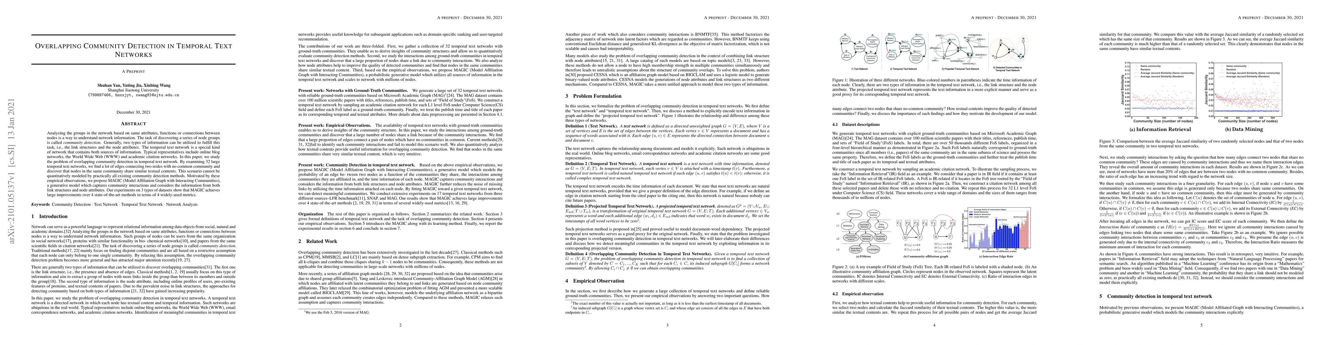 This paper proposes MAGIC, a generative model for overlapping community detection in temporal text networks, addressing the limitations of existing methods by incorporating both link structures and node attributes. Experiments demonstrate significant improvements over state-of-the-art methods on various datasets.