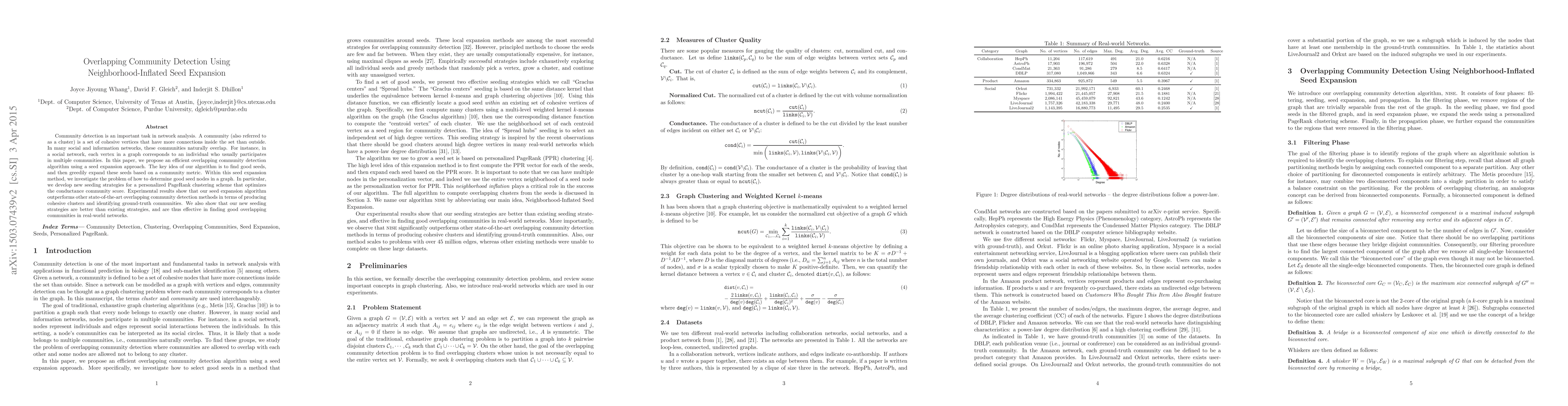 This paper proposes an efficient overlapping community detection algorithm using a neighborhood-inflated seed expansion approach. The method focuses on identifying good seed nodes and expanding them based on a community metric, optimizing the conductance score. Experimental results show superior performance compared to other methods.
