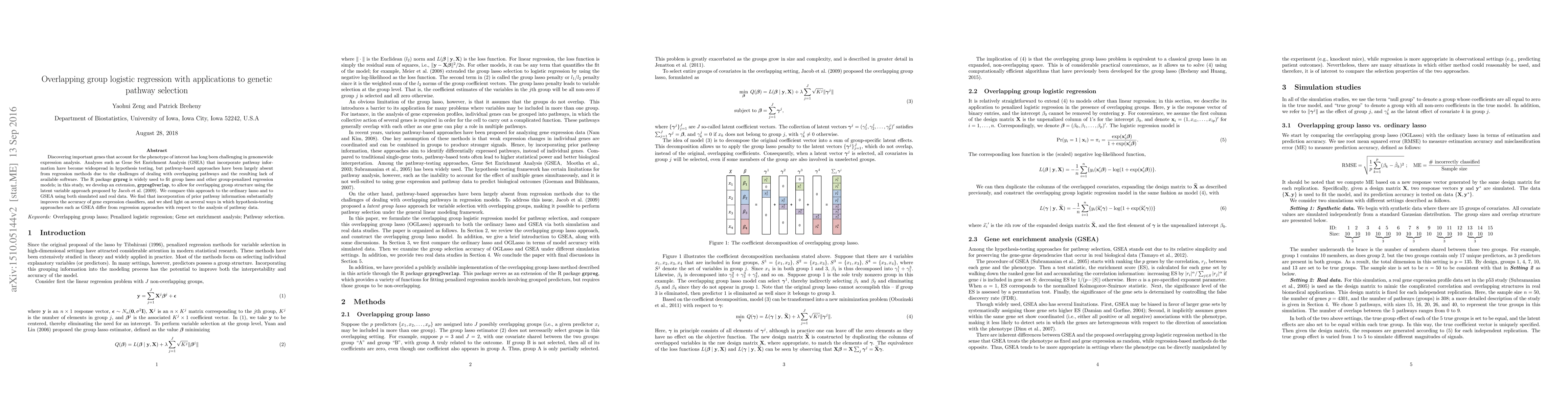 Discovering important genes that account for the phenotype of interest has long been challenging in genomewide expression analysis. Analyses such as Gene Set Enrichment Analysis (GSEA) that incorporate pathway information have become widespread in hypothesis testing, but pathway-based approaches have been largely absent from regression methods due to the challenges of dealing with overlapping pathways and the resulting lack of available software. The R package grpreg is widely used to fit group lasso and other group-penalized regression models; in this study, we develop an extension, grpregOverlap, to allow for overlapping group structure using the latent variable approach proposed by Jacob et al. (2009). We compare this approach to the ordinary lasso and to GSEA using both simulated and real data. We find that incorporation of prior pathway information substantially improves the accuracy of gene expression classifiers, and we shed light on several ways in which hypothesis-testing approaches such as GSEA differ from regression approaches with respect to the analysis of pathway data.