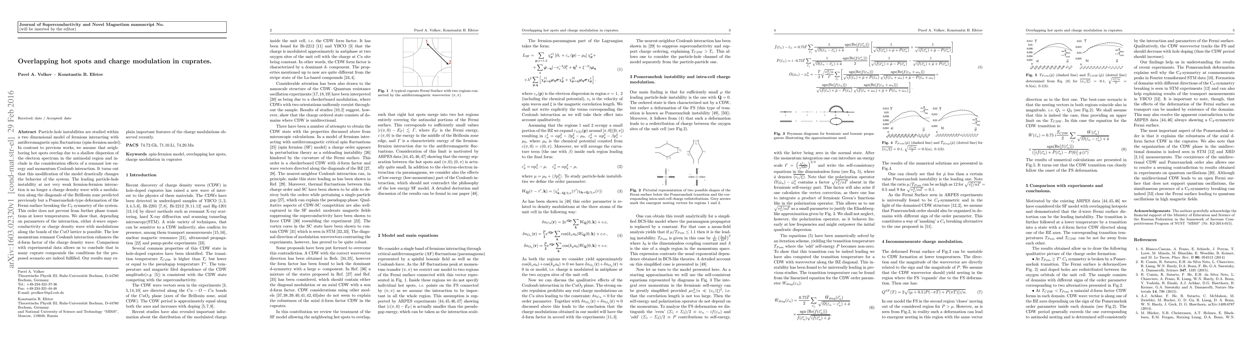 Particle-hole instabilities are studied within a two dimensional model of fermions interacting with antiferromagnetic spin fluctuations (spin-fermion model). In contrast to previous works, we assume that neighboring hot spots overlap due to a shallow dispersion of the electron spectrum in the antinodal region and include in the consideration effects of a remnant low energy and momentum Coulomb interaction. It turns out that this modification of the model drastically changes the behavior of the system. The leading particle-hole instability at not very weak fermion-fermion interaction is no longer a charge density wave with a modulation along the diagonals of the Brillouin zone predicted previously but a Pomeranchuk-type deformation of the Fermi surface breaking the C$_{4}$ symmetry of the system. This order does not prevent from further phase transitions at lower temperatures. We show that, depending on parameters of the interaction, either d-wave superconductivity or charge density wave with modulations along the bonds of the $CuO$ lattice is possible. The low momentum remnant Coulomb interaction enhances the d-form factor of the charge density wave. Comparison with experimental data allows us to conclude that in many cuprate compounds the conditions for the proposed scenario are indeed fulfilled. Our results may explain important features of the charge modulations observed recently.