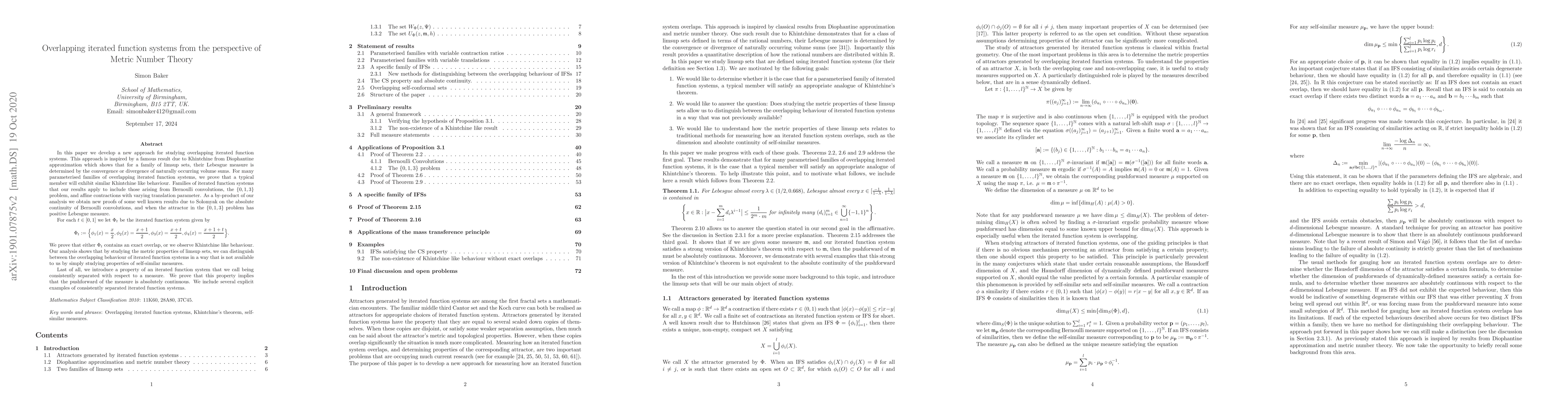 This paper develops a new approach using Metric Number Theory to study overlapping iterated function systems, inspired by Khintchine's result on Diophantine approximation. The authors prove that typical members of many parameterized families exhibit similar behavior, including Bernoulli convolutions and the $\{0,1,3\}$ problem, and introduce a new property called "consistently separated" which implies absolute continuity of the pushforward measure.