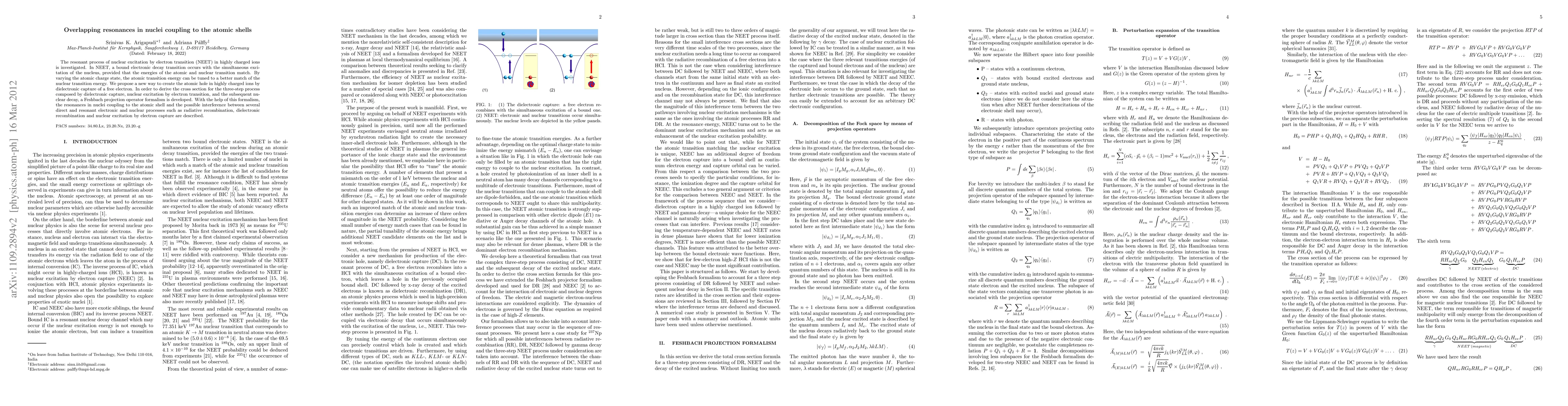 The resonant process of nuclear excitation by electron transition (NEET) in highly charged ions is investigated. In NEET, a bound electronic decay transition occurs with the simultaneous excitation of the nucleus, provided that the energies of the atomic and nuclear transition match. By varying the atomic charge state, the atomic transition energy can be tuned to a better match of the nuclear transition energy. We propose a new way to create the atomic hole in highly charged ions by dielectronic capture of a free electron. In order to derive the cross section for the three-step process composed by dielectronic capture, NEET, and the subsequent nuclear decay, a Feshbach projection operator formalism is developed. With the help of this formalism, the resonances in nuclei coupling to the atomic shell and the possible interference between several direct and resonant electronic and nuclear processes such as radiative recombination, dielectronic recombination and nuclear excitation by electron capture are described.