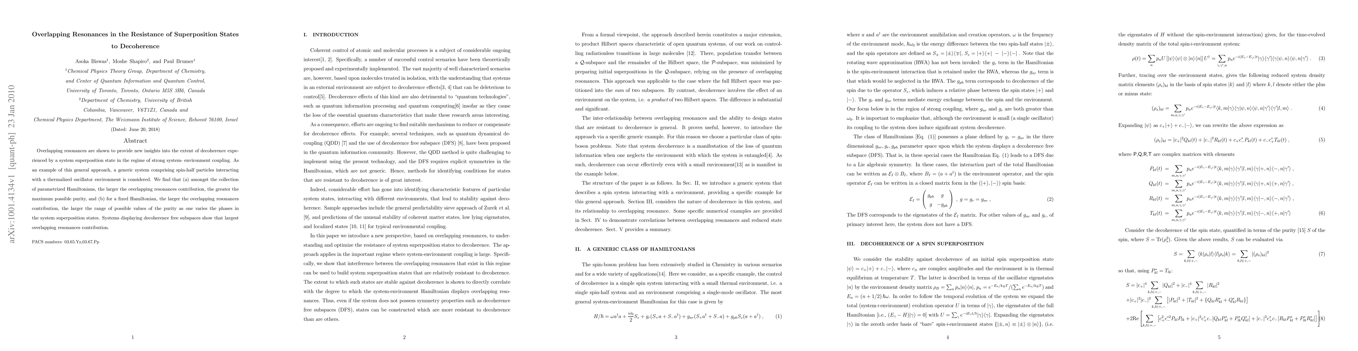 Overlapping resonances are shown to provide new insights into the extent of decoherence experienced by a system superposition state in the regime of strong system- environment coupling. As an example of this general approach, a generic system comprising spin-half particles interacting with a thermalized oscillator environment is considered. We find that (a) amongst the collection of parametrized Hamiltonians, the larger the overlapping resonances contribution, the greater the maximum possible purity, and (b) for a fixed Hamiltonian, the larger the overlapping resonances contribution, the larger the range of possible values of the purity as one varies the phases in the system superposition states. Systems displaying decoherence free subspaces show that largest overlapping resonances contribution.