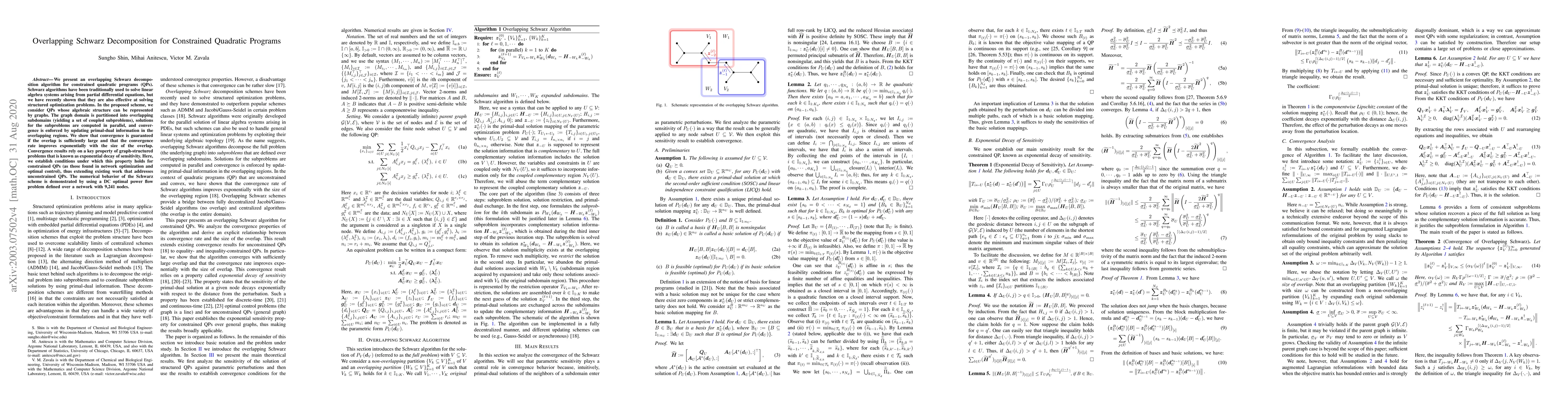 This paper introduces an overlapping Schwarz decomposition algorithm for solving constrained quadratic programs, demonstrating its effectiveness through parallel computation and convergence enforcement via overlapping subdomains. The method leverages the exponential decay of sensitivity in graph-structured problems to ensure convergence and improve the rate, extending previous work on unconstrained QPs.
