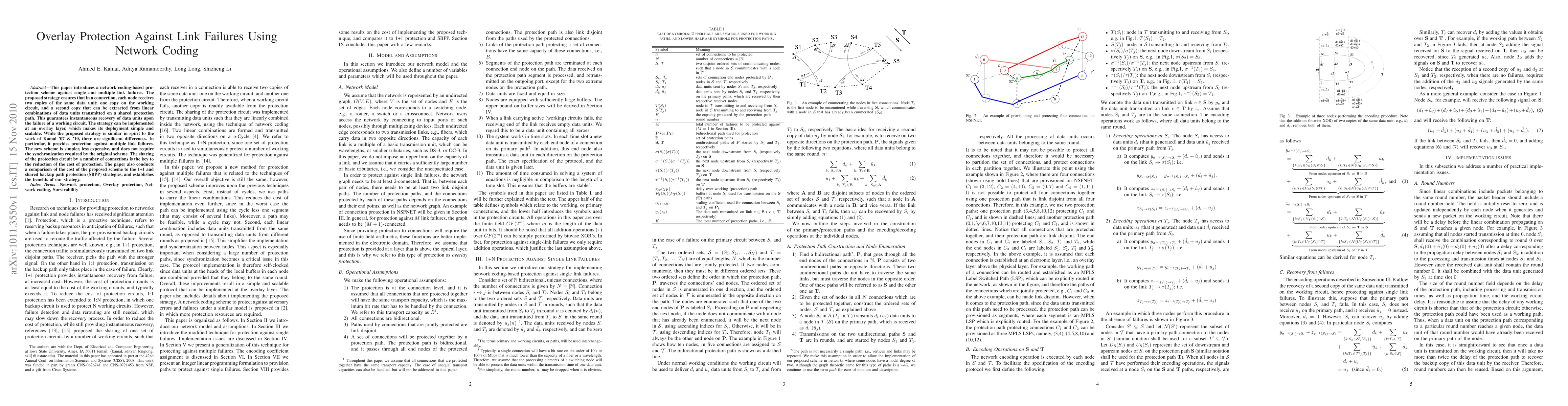 This paper proposes a network coding-based protection scheme to recover data instantly upon link failures, utilizing an overlay layer for simple and scalable deployment. Unlike previous methods, it effectively protects against multiple link failures with reduced cost and complexity.