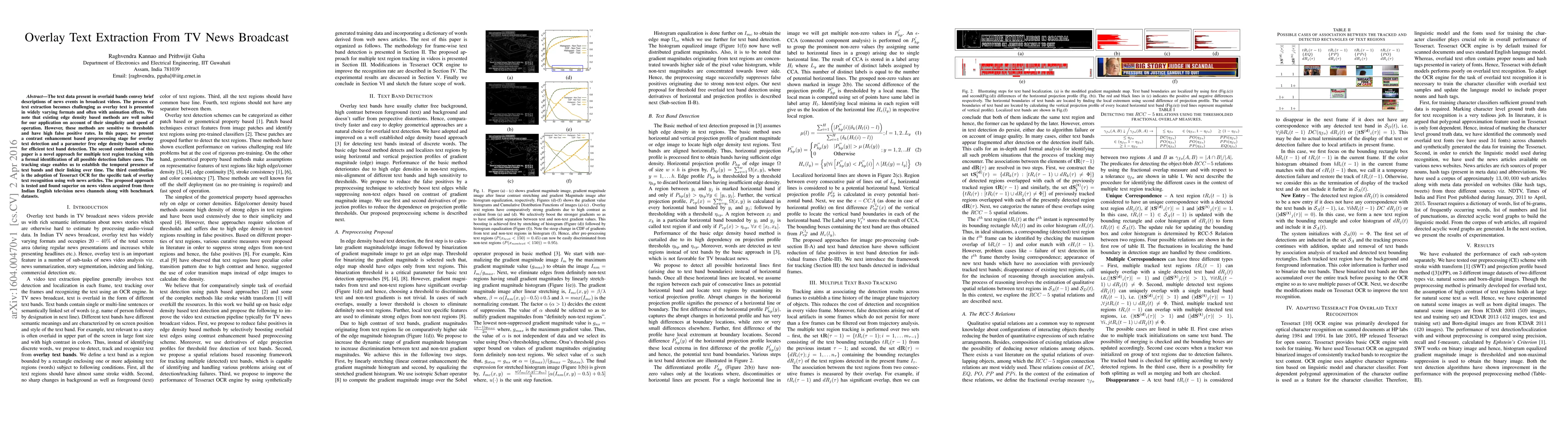 This paper proposes a method for extracting overlay text from TV news broadcasts, utilizing contrast enhancement and edge density for detection, a novel tracking approach for text regions, and Tesseract OCR for recognition. The method is shown to be effective on news videos from three Indian English television channels and benchmark datasets.