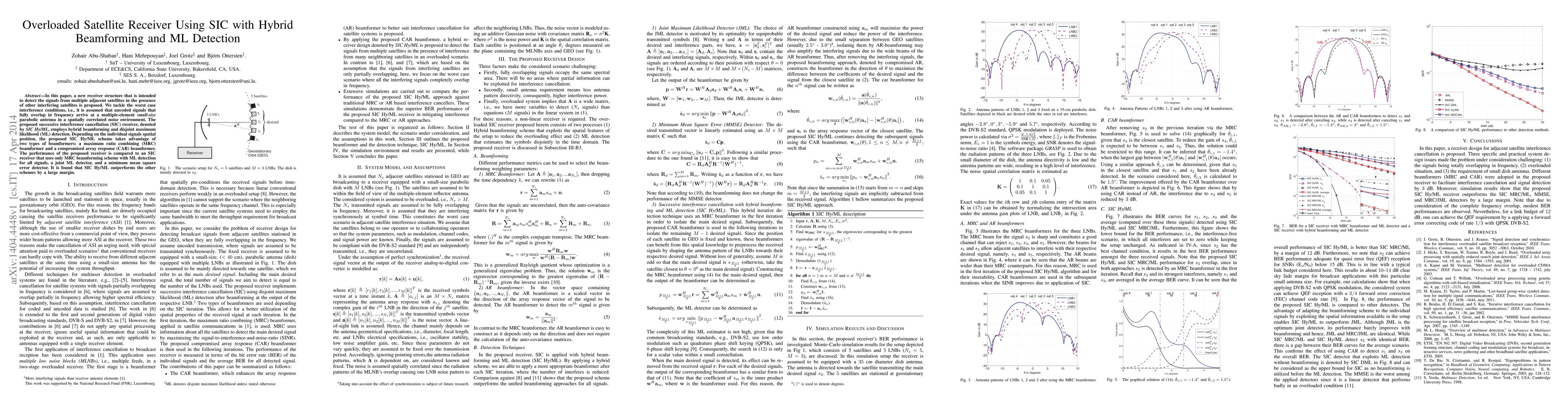 In this paper, a new receiver structure that is intended to detect the signals from multiple adjacent satellites in the presence of other interfering satellites is proposed. We tackle the worst case interference conditions, i.e., it is assumed that uncoded signals that fully overlap in frequency arrive at a multiple-element small-size parabolic antenna in a spatially correlated noise environment. The proposed successive interference cancellation (SIC) receiver, denoted by SIC Hy/ML, employs hybrid beamforming and disjoint maximum likelihood (ML) detection. Depending on the individual signals spatial position, the proposed SIC Hy/ML scheme takes advantage of two types of beamformers: a maximum ratio combining (MRC) beamformer and a compromised array response (CAR) beamformer. The performance of the proposed receiver is compared to an SIC receiver that uses only MRC beamforming scheme with ML detection for all signals, a joint ML detector, and a minimum mean square error detector. It is found that SIC Hy/ML outperforms the other schemes by a large margin.