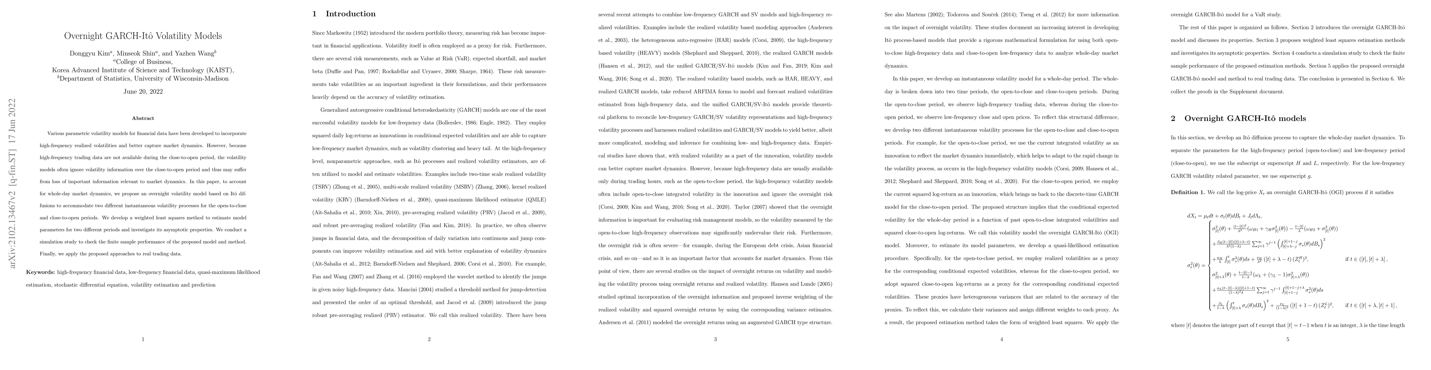 This paper proposes an overnight GARCH-Itô volatility model to capture whole-day market dynamics by incorporating two different instantaneous volatility processes for open-to-close and close-to-open periods. The authors develop a weighted least squares method for parameter estimation and validate the model through simulation and real trading data analysis.