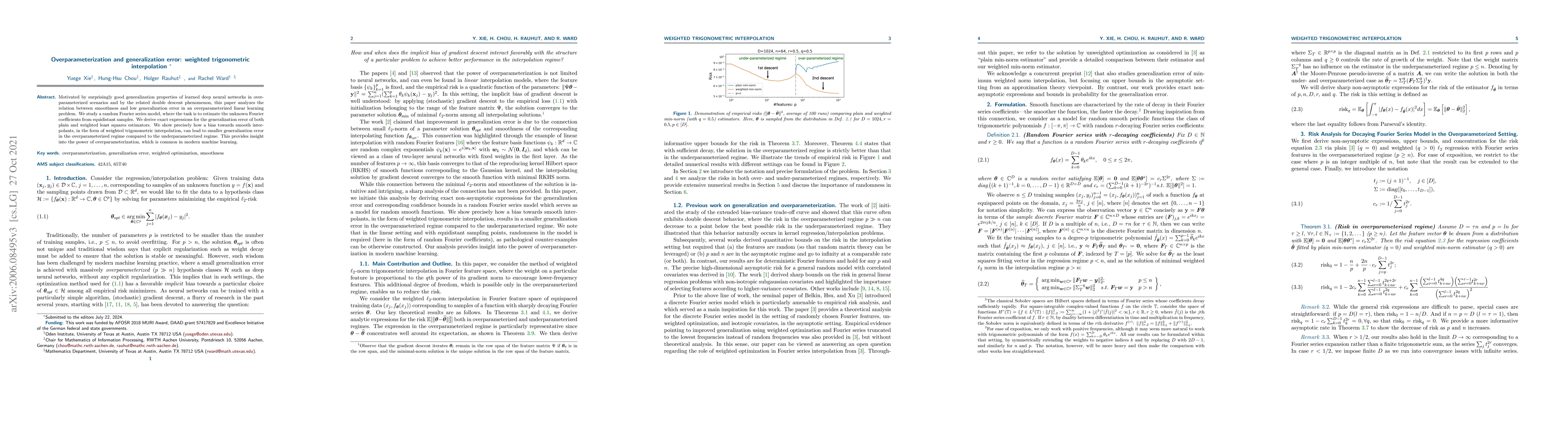 Motivated by surprisingly good generalization properties of learned deep neural networks in overparameterized scenarios and by the related double descent phenomenon, this paper analyzes the relation between smoothness and low generalization error in an overparameterized linear learning problem. We study a random Fourier series model, where the task is to estimate the unknown Fourier coefficients from equidistant samples. We derive exact expressions for the generalization error of both plain and weighted least squares estimators. We show precisely how a bias towards smooth interpolants, in the form of weighted trigonometric interpolation, can lead to smaller generalization error in the overparameterized regime compared to the underparameterized regime. This provides insight into the power of overparameterization, which is common in modern machine learning.