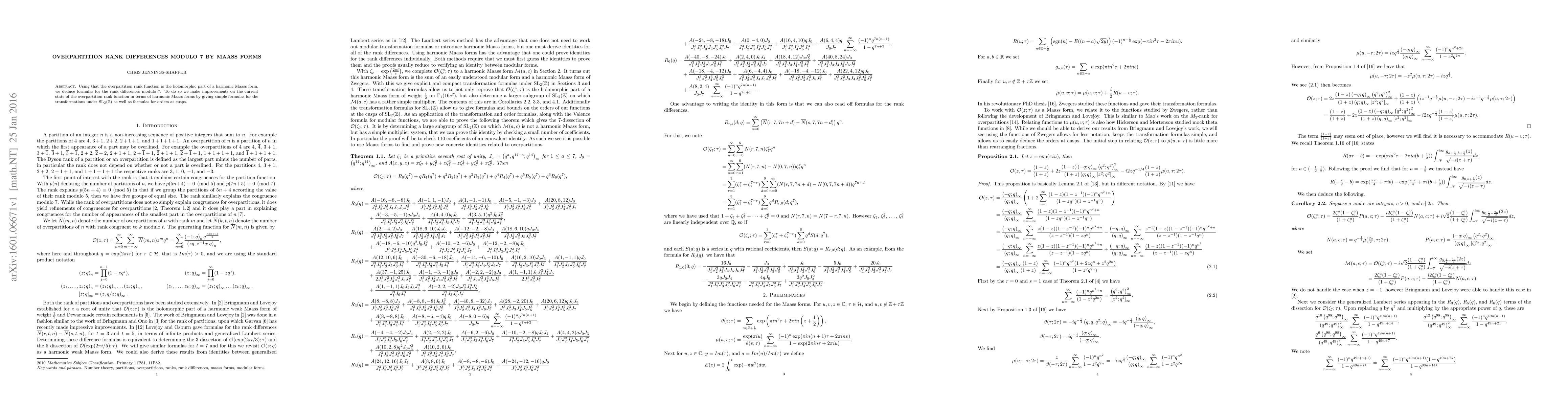 This paper derives formulas for rank differences of overpartitions modulo 7 using harmonic Maass forms, improving the current understanding by providing simple transformation formulas under $\mbox{SL}_2(\mathbb{Z})$ and cusp order formulas.