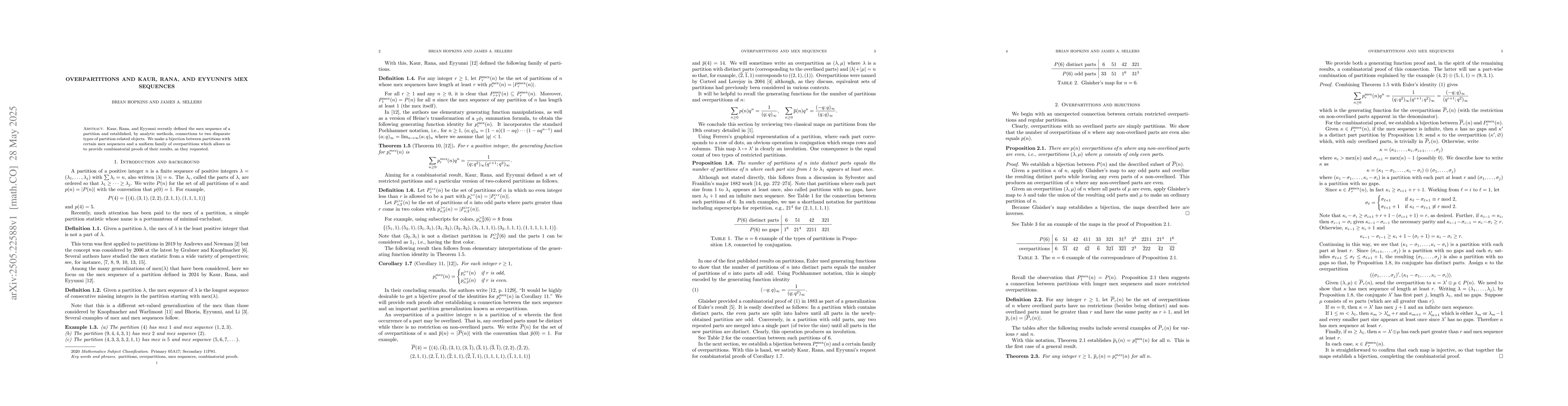 The research establishes a bijection between specific partitions with mex sequences and a uniform family of overpartitions, providing combinatorial proofs for previously analytic results by Kaur, Rana, and Eyyunni.